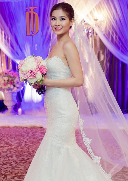 Mẫu váy đơn giản được thiết kế cổ điển với phần cúp ngực tinh tế và đuôi cá được phủ chất liệu ren cao cấp, Á hậu Việt Nam 2014 đẹp tựa nàng công chúa trong mẫu váy này. Phần lúp khá hoành tráng giúp cô như nàng tiểu thư yêu kiều trong ngày cưới.