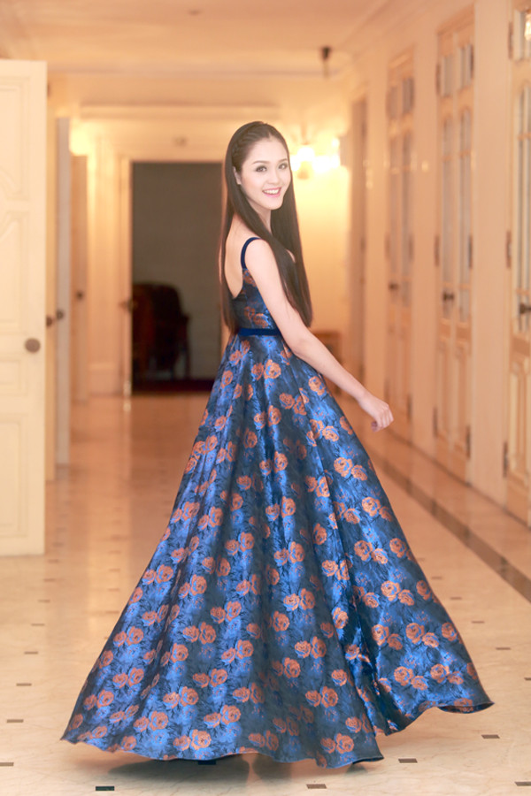 Người đẹp diện bộ váy hoa tông màu xanh nhẹ nhàng, duyên dáng.