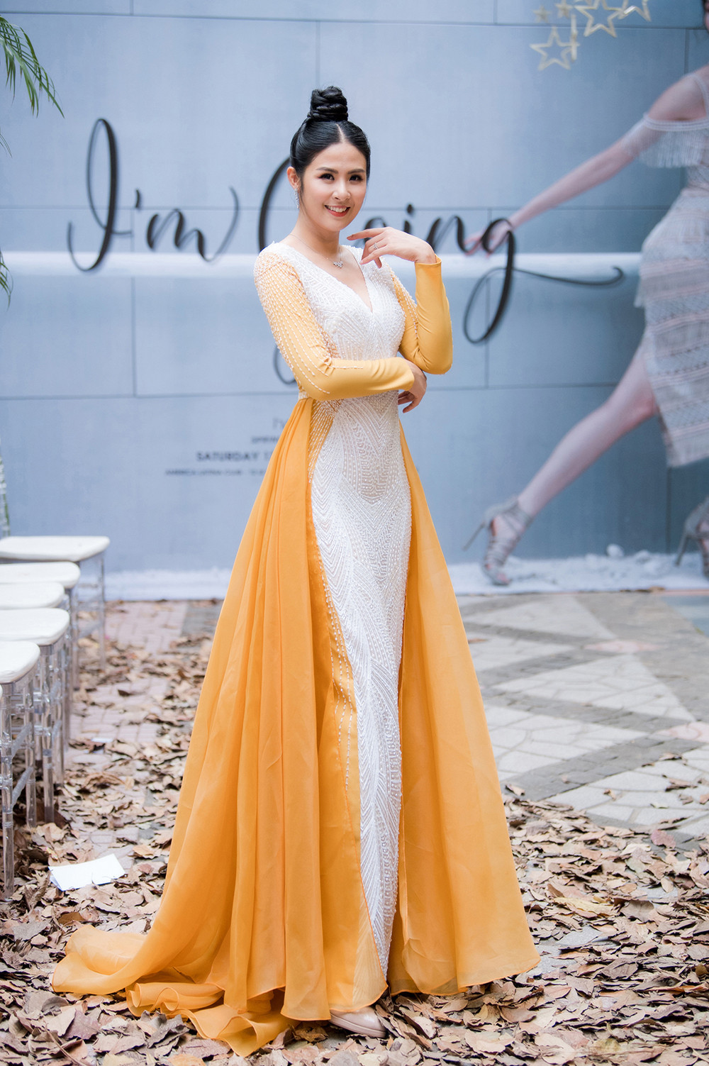 Hoa hậu Ngọc Hân lộng lẫy với bộ váy dạ hội kết hợp hai tông màu vàng và trắng.