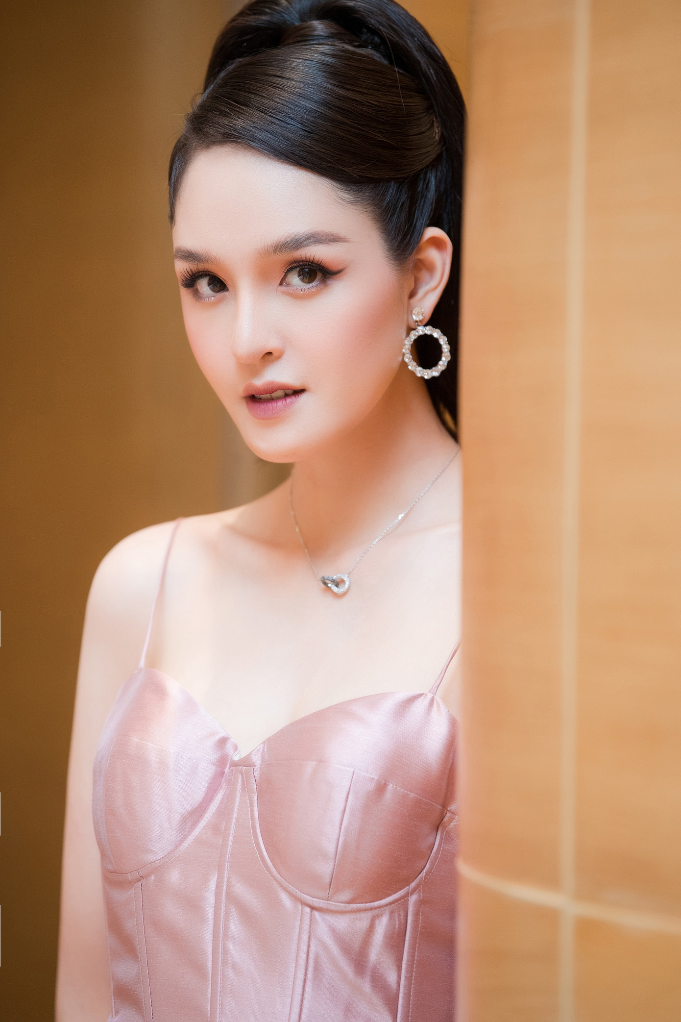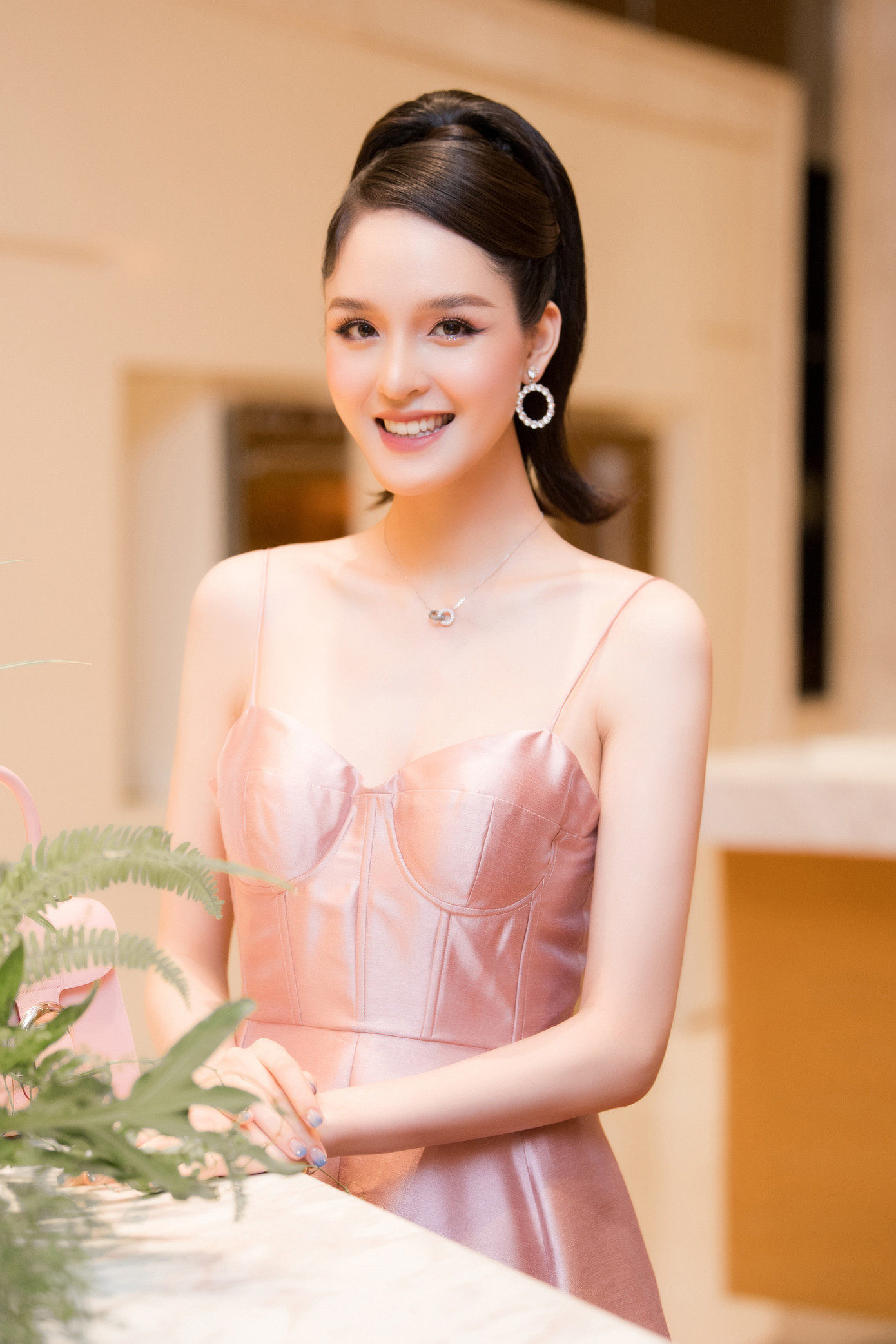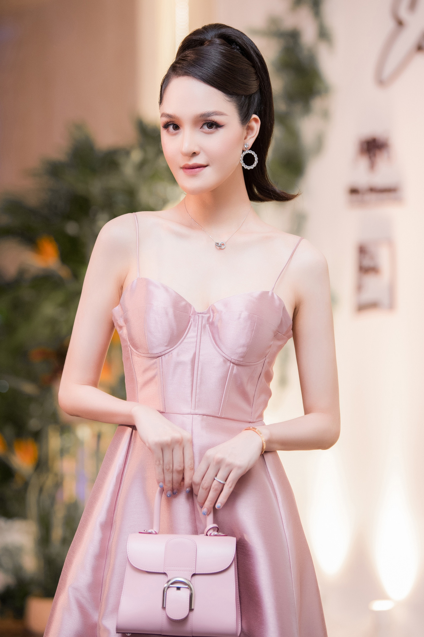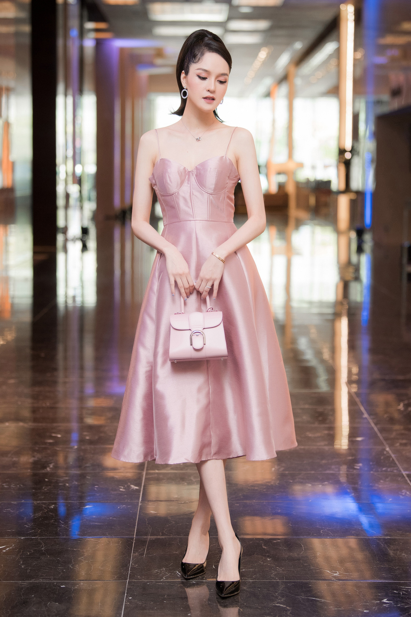 Cô diện bộ váy hai dây tông màu hồng pastel vô cùng ngọt ngào, khoe vòng một quyến rũ và bờ vai trần thon thả.