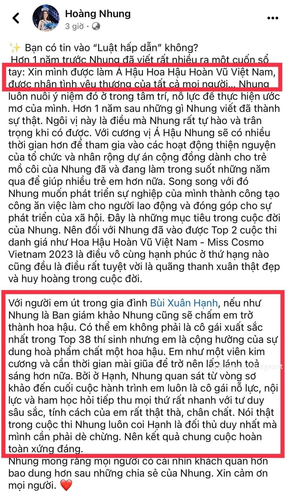 Mới đây, trên trang cá nhân, Á hậu Hoa hậu Hoàn vũ Việt Nam 2023 Hoàng Thị Nhung đã đăng một bài chia sẻ về Hoa hậu Xuân Hạnh, nội dung như sau: