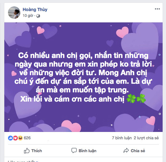 Trước những thông tin dồn dập về việc Hoàng Thuỳ đang hẹn hò với Rocker Nguyễn, cô đã bất ngờ có những phản ứng trên trang cá nhân. Hoàng Thuỳ viết: "Có nhiều anh chị gọi, nhắn tin những ngày qua nhưng em xin phép không trả lời về những việc đời tư. Mong anh chị chú ý đến dự án sắp tới của em. Là dự án mà em muốn tập trung. Xin lỗi và cảm ơn các anh chị".