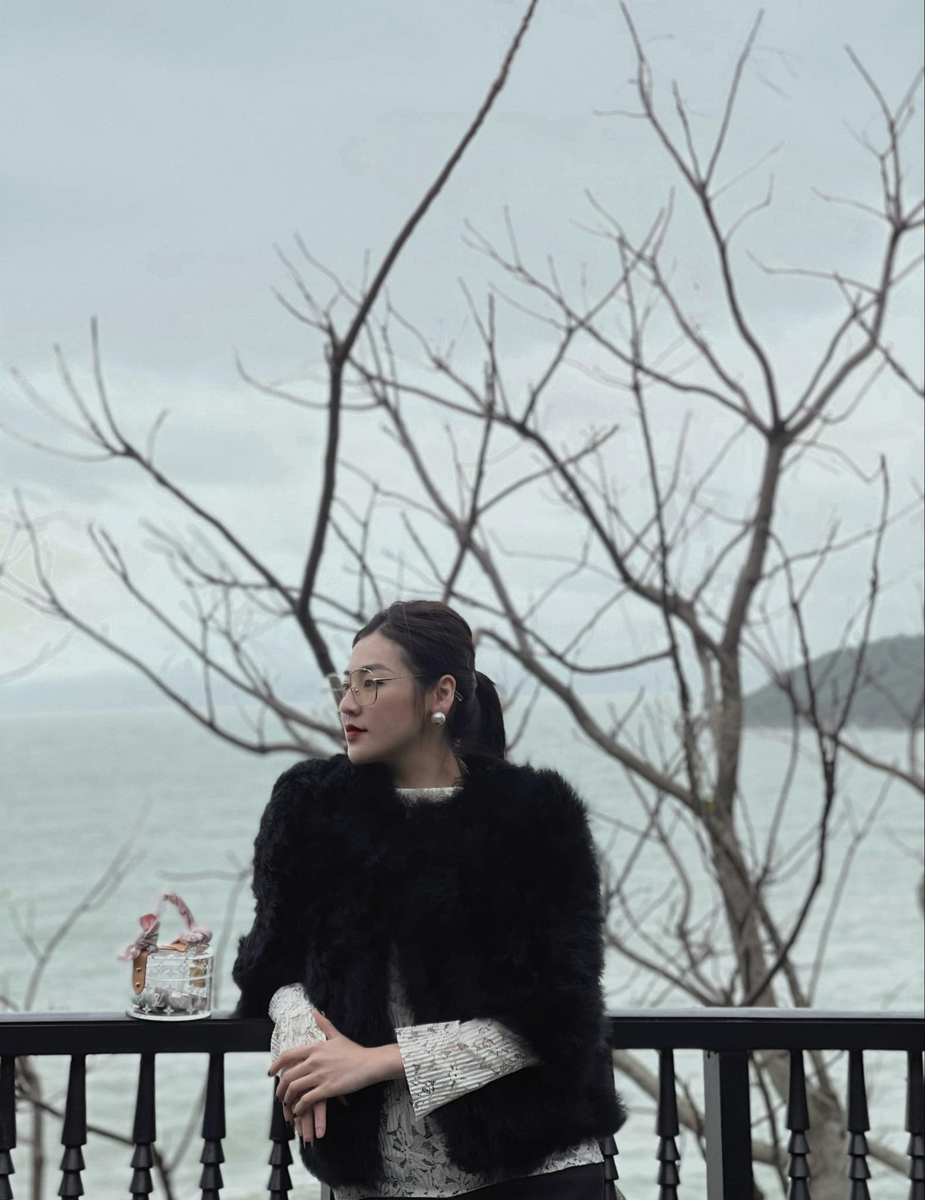 Á hậu Tú Anh ấm áp với áo khoác lông khi khoe dáng trên biển Đà Nẵng.