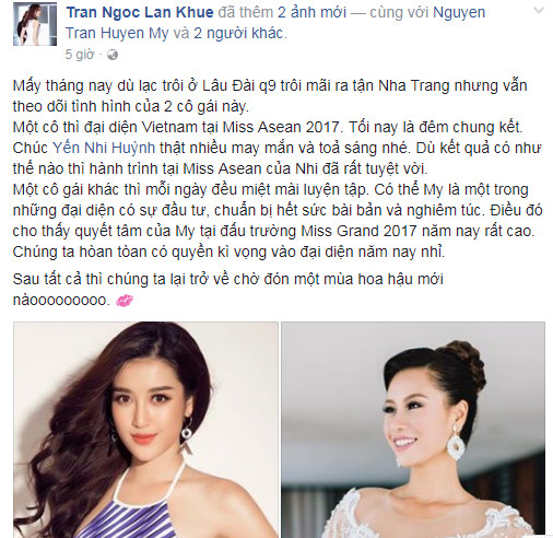 Mới đây, siêu mẫu Lan Khuê cũng dành cho Huyền My những lời có cánh trên facebook cá nhân: "Có thể My là một trong những đại diện có sự đầu tư, chuẩn bị hết sức bài bản và nghiêm túc. Điều đó cho thấy quyết tâm của My tại đấu trường Miss Grand 2017 năm nay rất cao. Chúng ta hòan tòan có quyền kì vọng vào đại diện năm nay nhỉ".