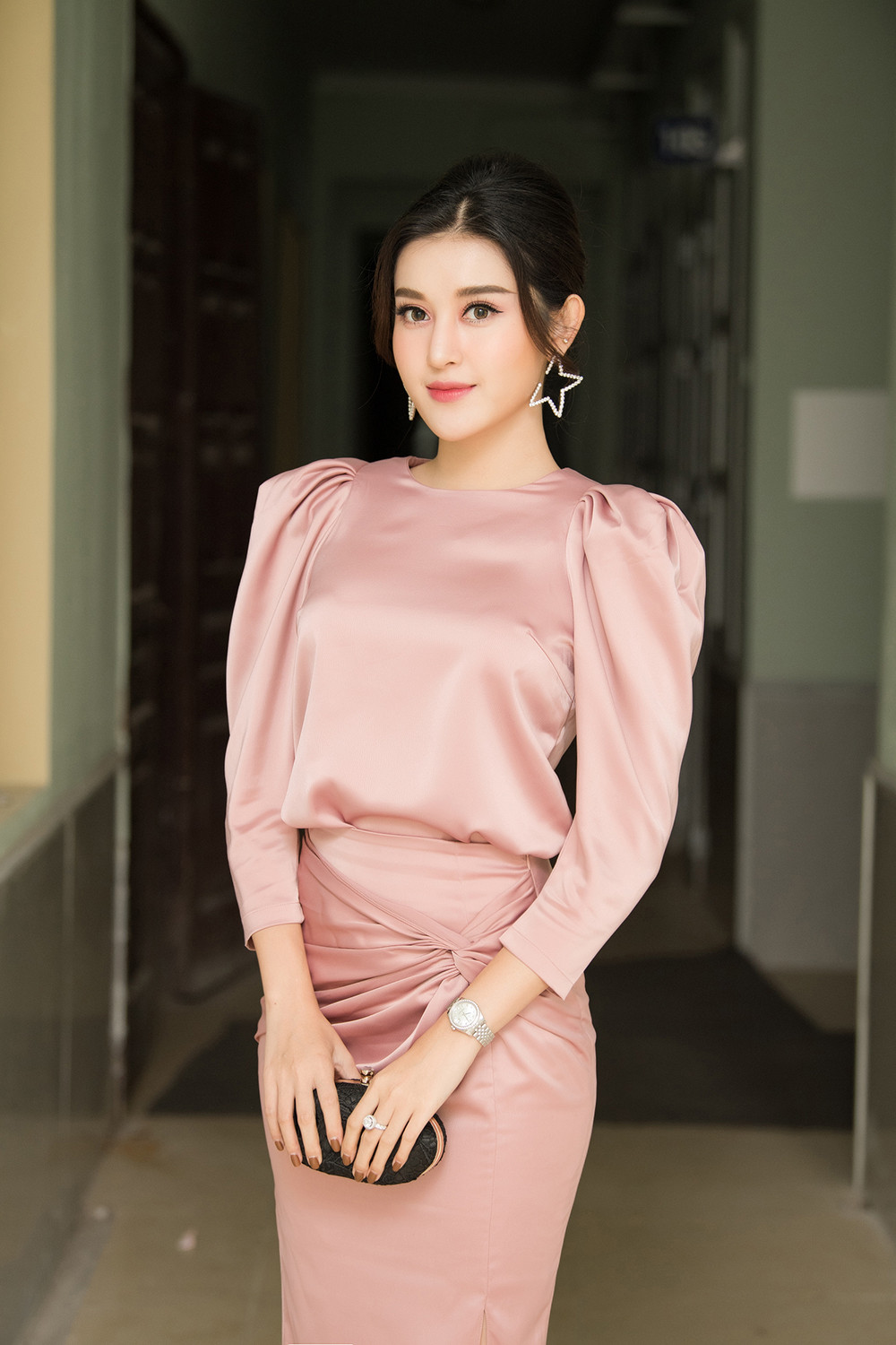Huyền My kín đáo và thanh lịch trong bộ váy màu hồng duyên dáng.