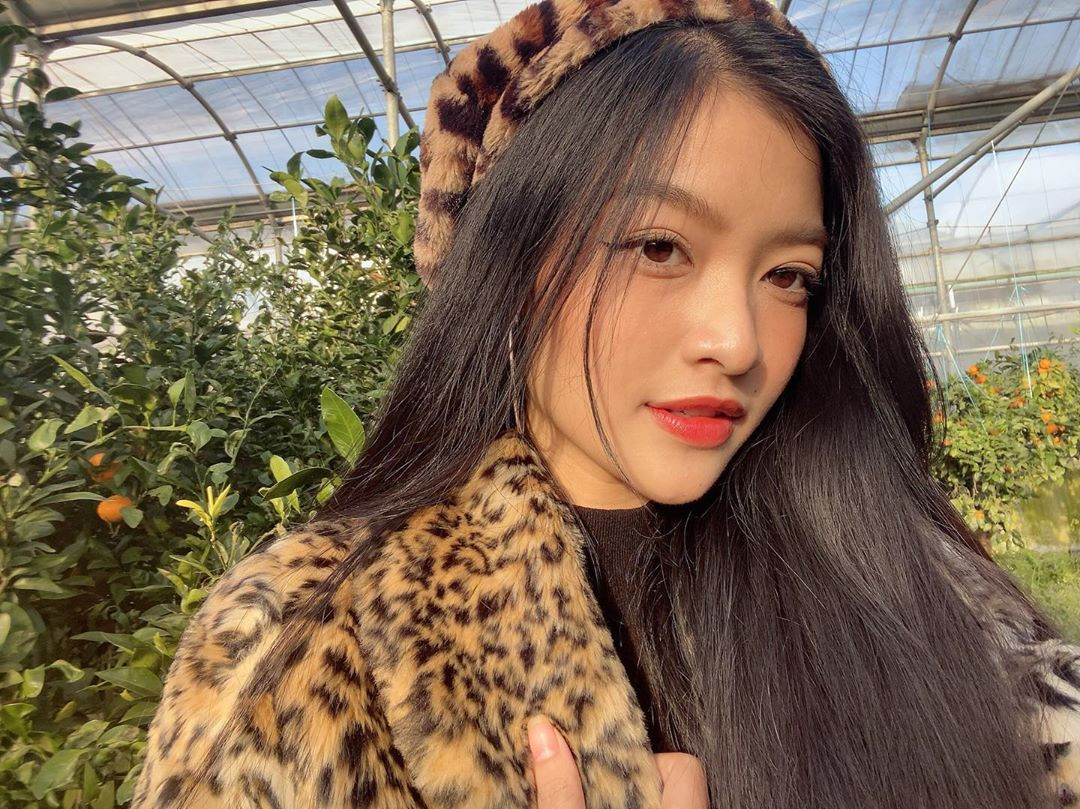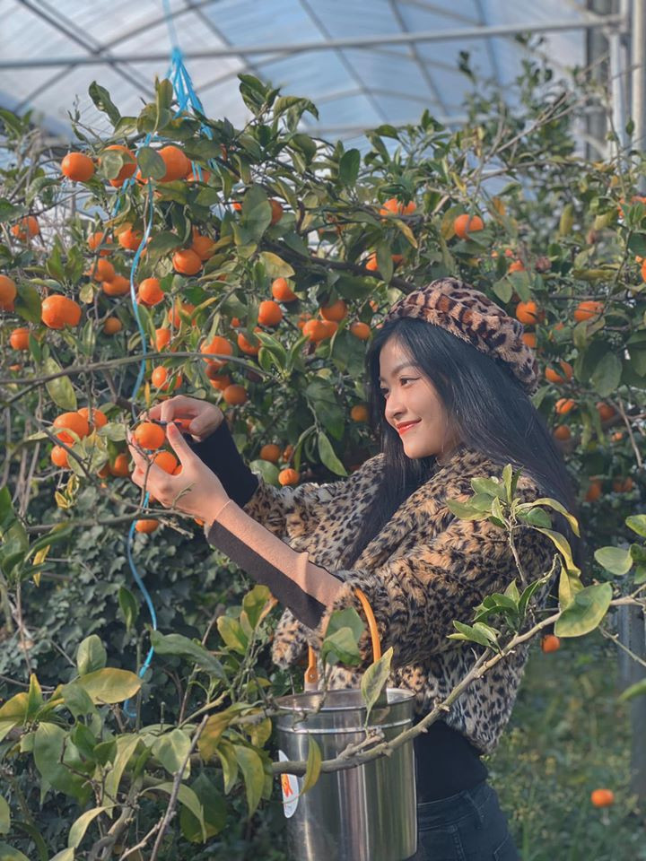 Á hậu Kiều Loan hào hứng khi đi thăm vườn cam trong chuyến du lịch Hàn Quốc.