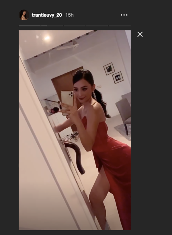 Hoa hậu Tiểu Vy khoe đường cong hút mắt với váy dạ hội đỏ rực, chuẩn bị tham dự sự kiện.