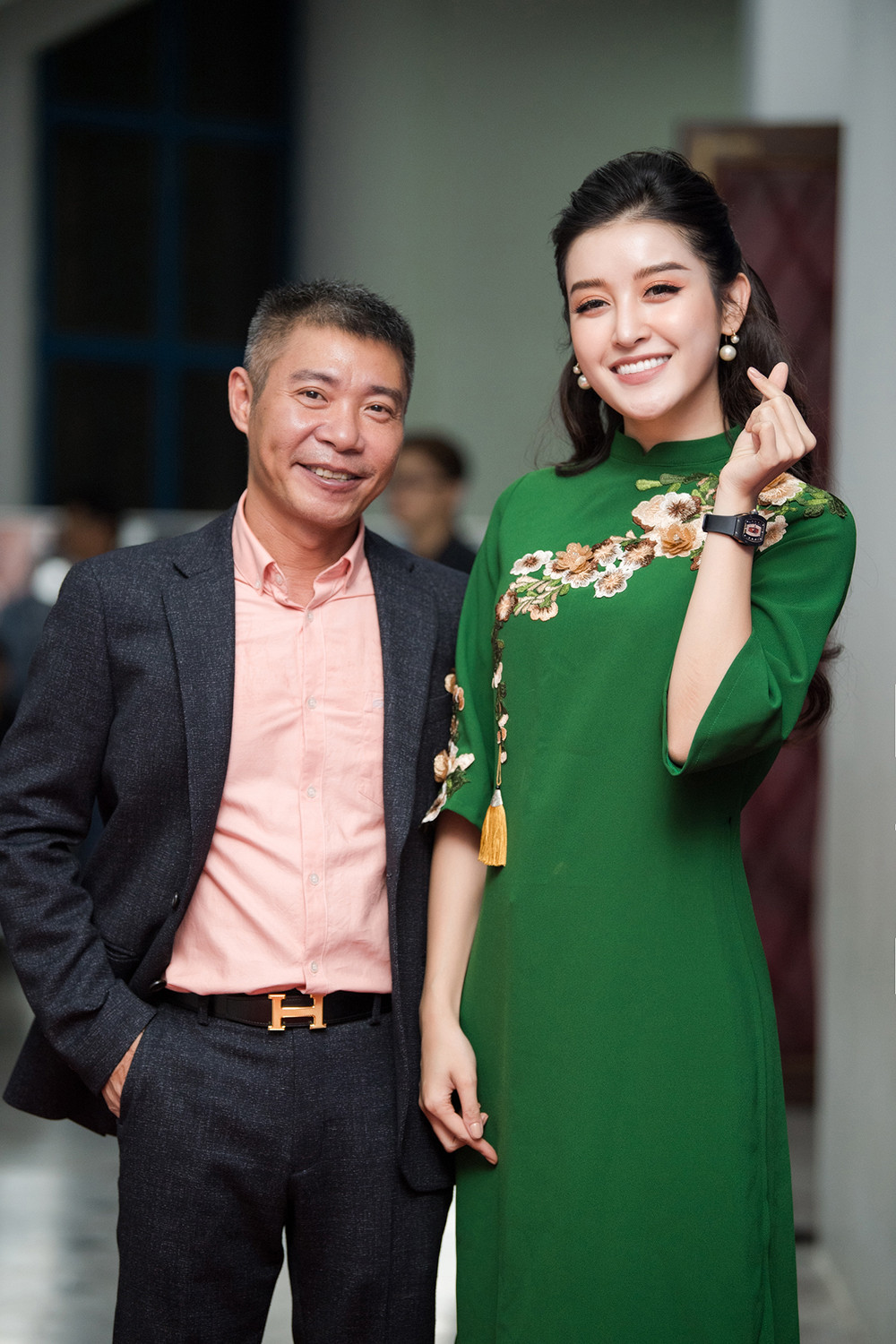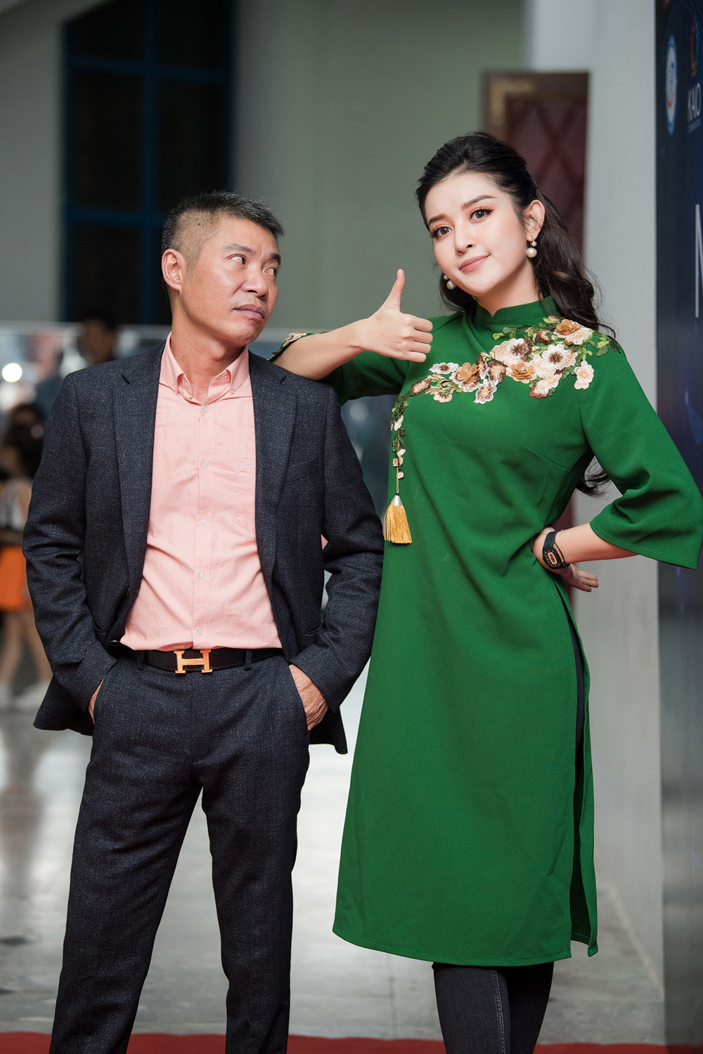 Từng làm việc với nhau trong nhiều chương trình nên cả hai vô cùng thân thiết. Á hậu Huyền My và NSND Công Lý cũng không ngần ngại tạo dáng nhí nhảnh, thân mật trên thảm đỏ mặc dù Cô Đẩu được bạn gái tháp tùng tới chương trình.
