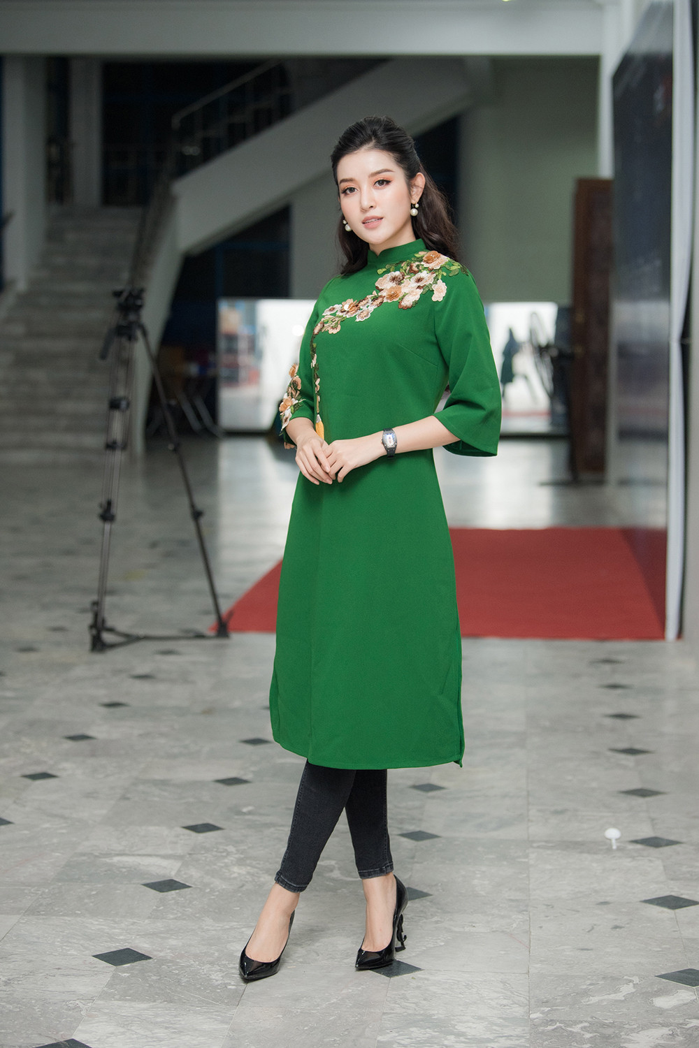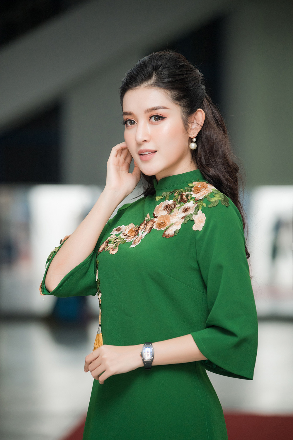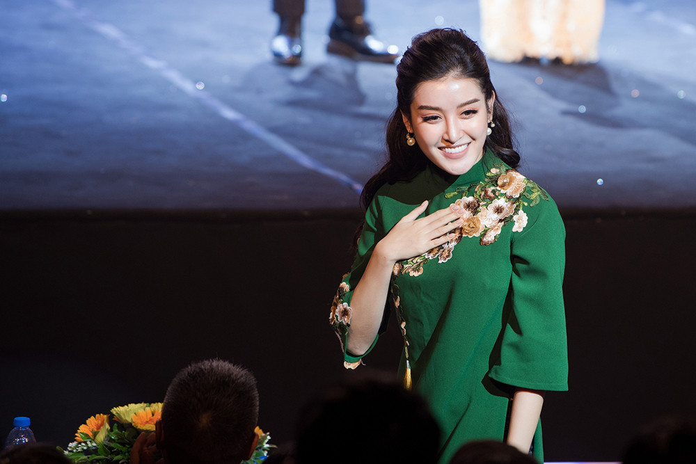 Xuất hiện tại chương trình, Huyền My lựa chọn bộ áo dài cách tân màu xanh thêu hoa thanh lịch, duyên dáng.