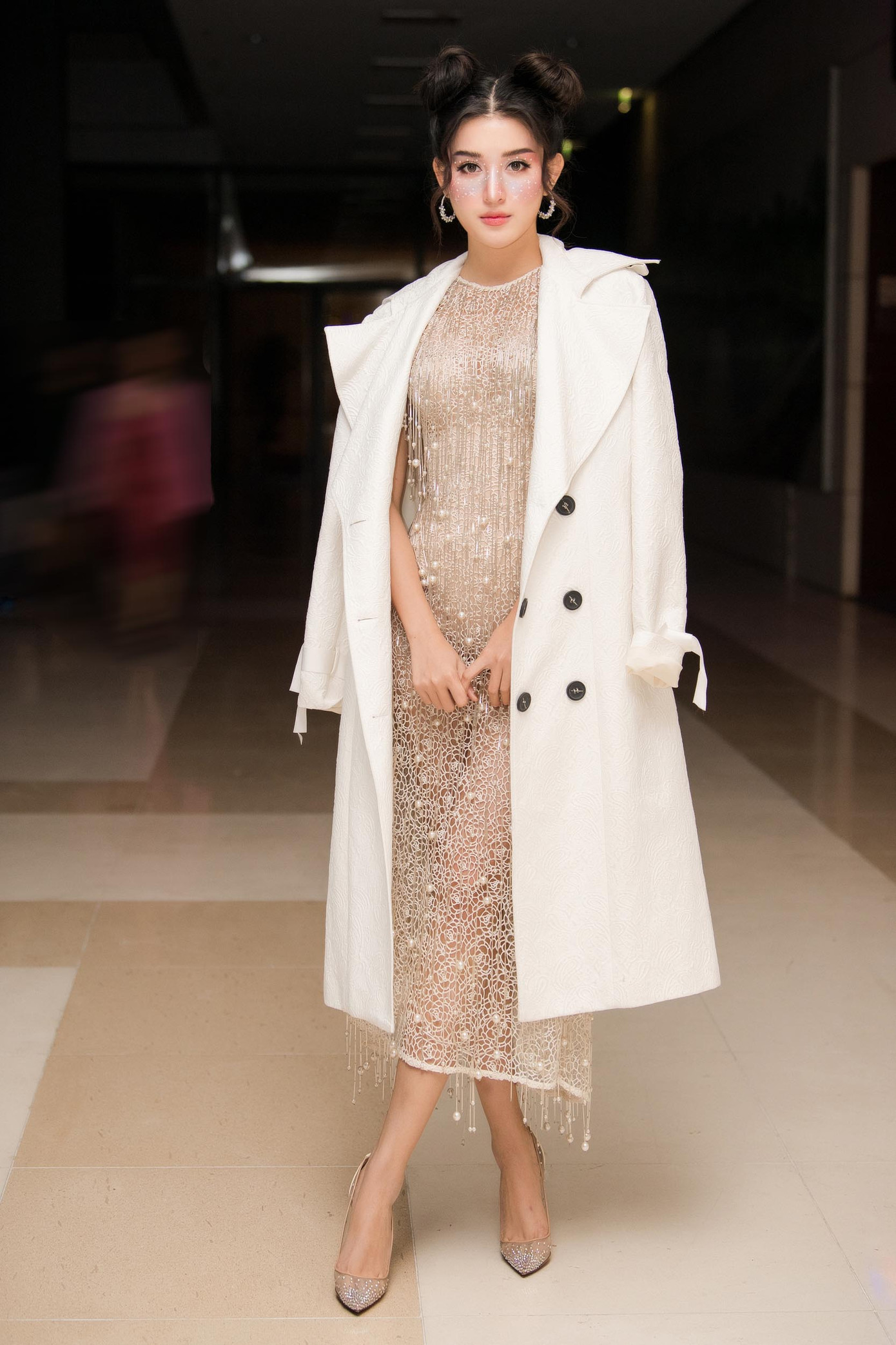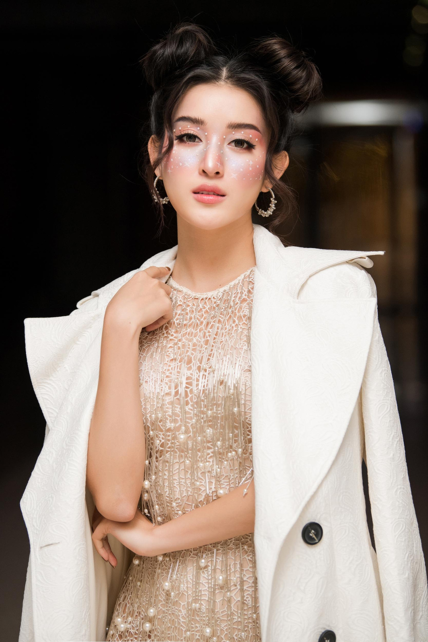 Tuy nhiên, điểm nhấn của Huyền My chính là diện mạo của cô khi người đẹp búi tóc Na Tra và đầu tư cho phong cách trang điểm kim tuyến lấp lánh xung quanh mắt.