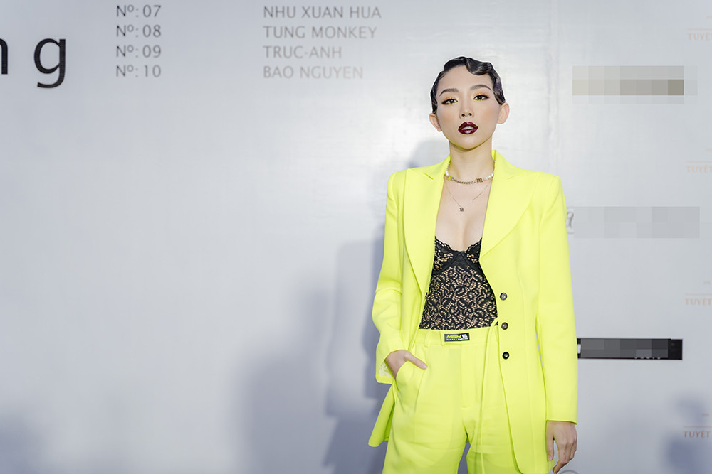 Ca sĩ Tóc Tiên diện suit màu vàng chanh nổi bật, kết hợp với nội y ren màu đen gợi cảm.