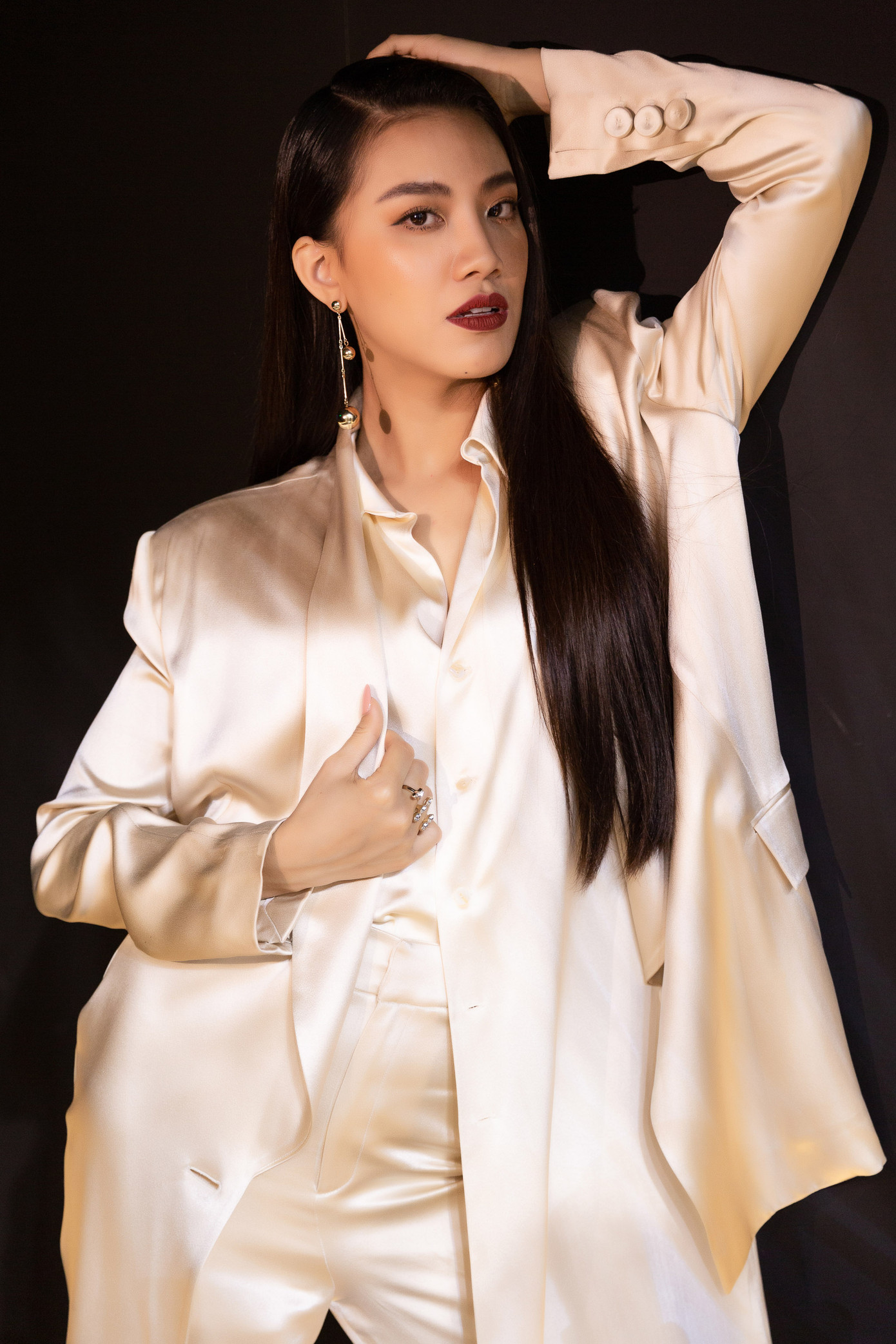 Á hậu Kim Duyên diện suit lụa phong cách menswear cá tính.