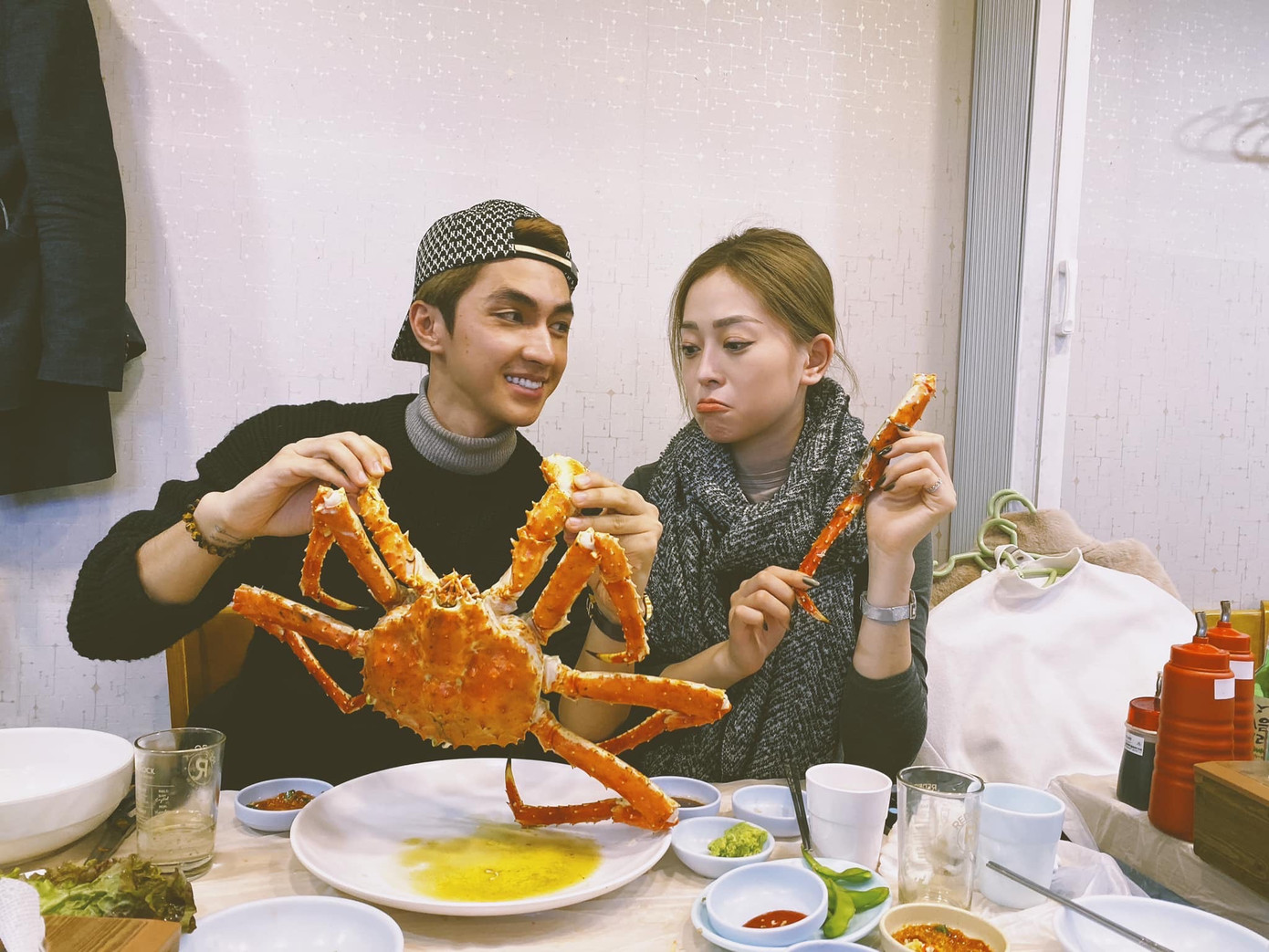 Á hậu Phương Nga và bạn trai Bình An thích thú thưởng thức hải sản khi đi du lịch Hàn Quốc.