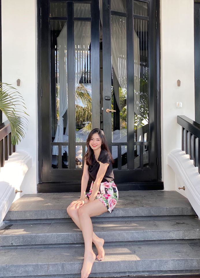 Á hậu Ngô Trà My khoe chân dài quyến rũ bên hiên nhà.