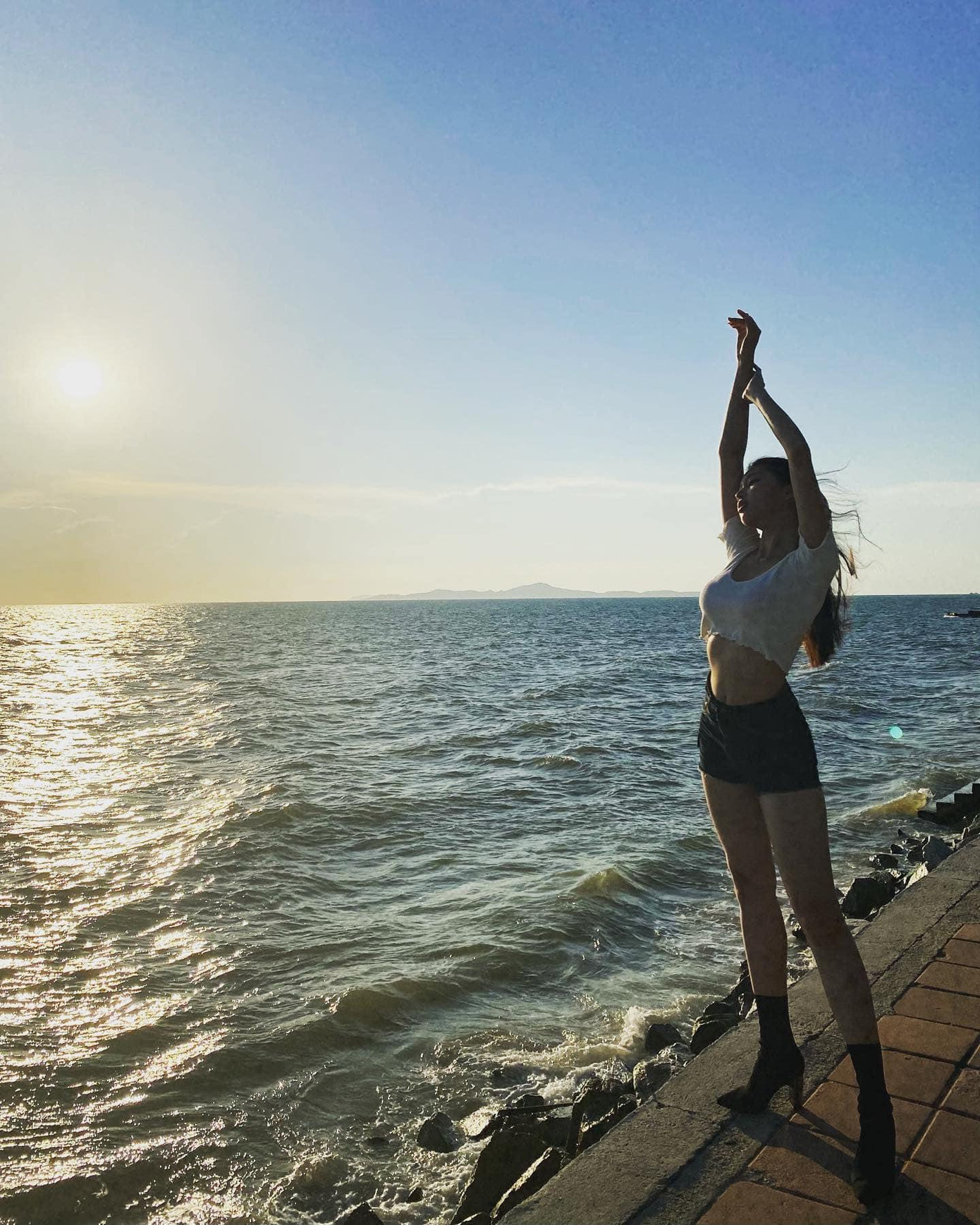 Cô nàng diện áo crop-top, quần short bò, khoe vóc dáng cực nóng bỏng, quyến rũ bên bờ biển Thái Lan.
