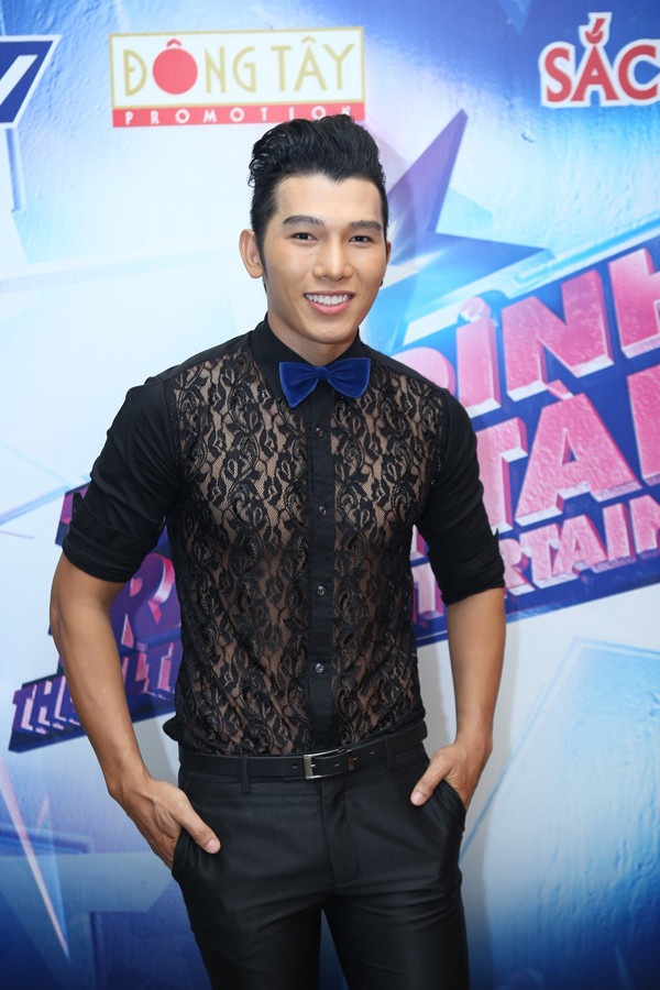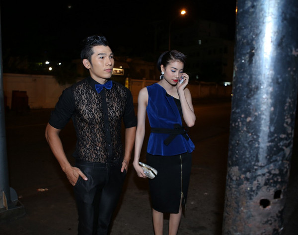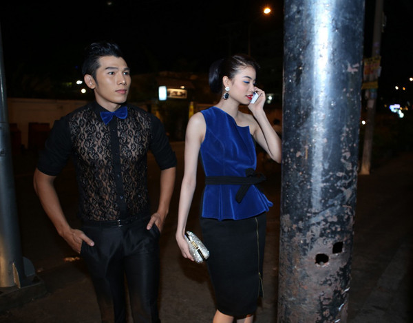 Siêu mẫu Ngọc Tình ăn mặc rất bảnh bao và cầu kỳ với áo sơ-mi chất liệu ren xuyên thấu, khoe khéo hình thể đẹp.
