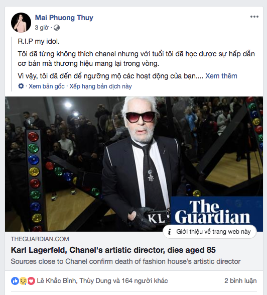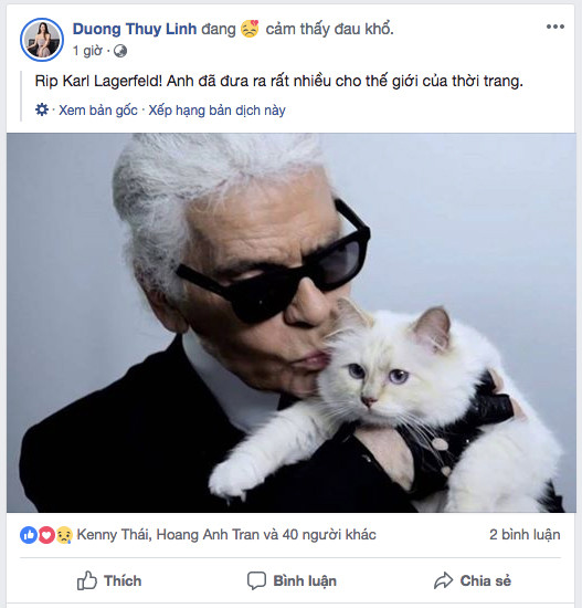 Hoa hậu Mai Phương Thuý cũng bày tỏ sự thương tiếc trước sự ra đi của Karl Lagerfeld trên trang cá nhân.