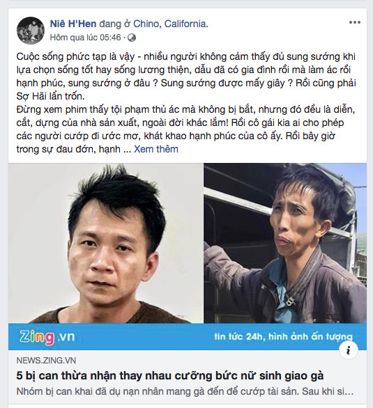 Trước đó trên trang cá nhân, H'Hen Niê cũng thể hiện tâm trạng bức xúc và gay gắt với các đối tượng sát hại nữ sinh giao gà ở Điện Biên.