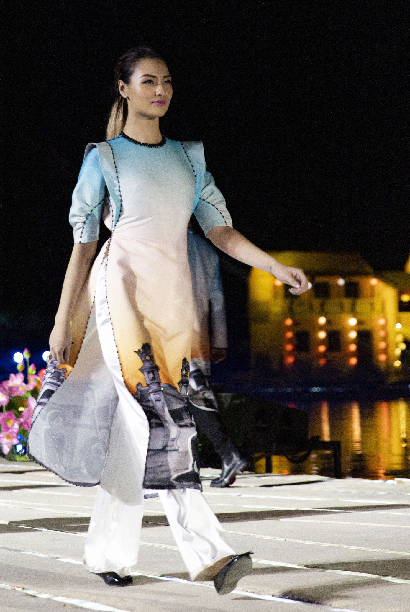 Người mẫu Hồng Quế trình diễn một mẫu áo dài lấy ý tưởng từ Ca Trù - loại hình diễn xướng bằng âm nhạc thịnh hành tại khu vực Bắc Bộ và Bắc Trung Bộ Việt Nam.