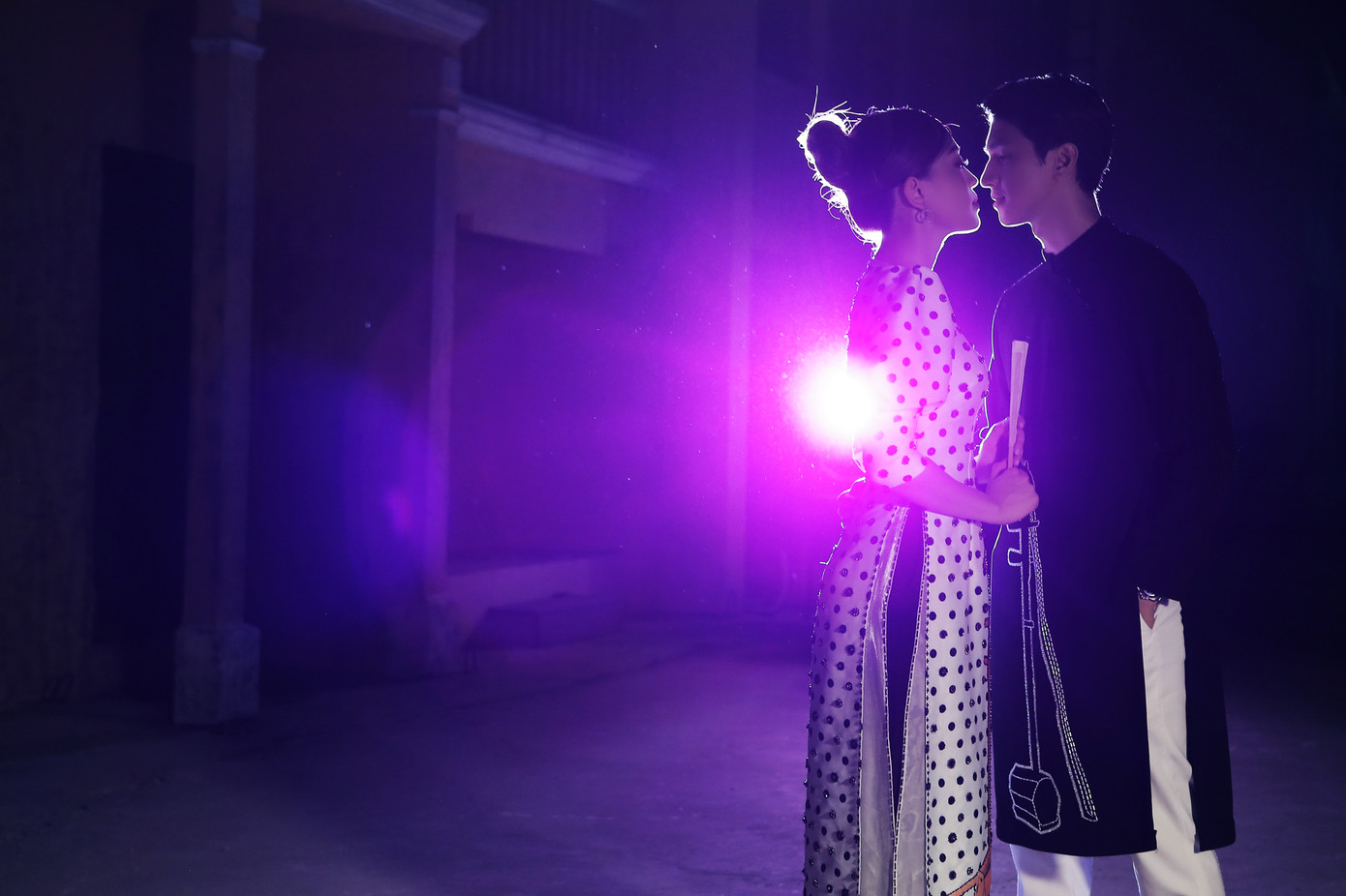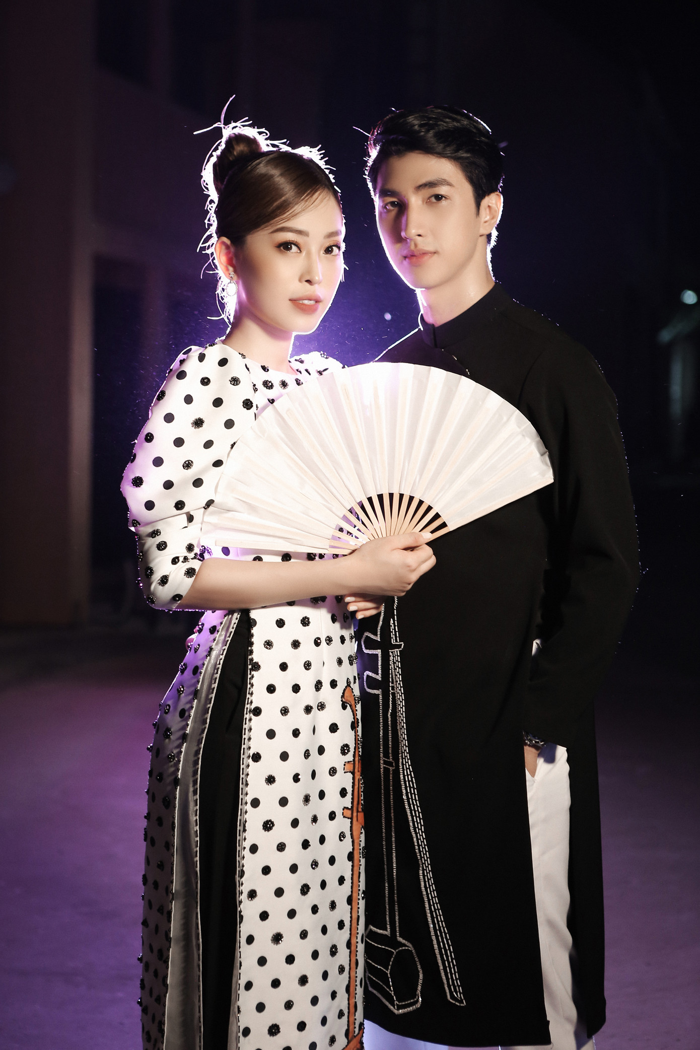 Nếu nam diễn viên ‘Gái già lắm chiêu 3’ diện áo dài đen, bạn gái anh lại khoác áo dài trắng chấm bi với chi tiết vai áo phồng.