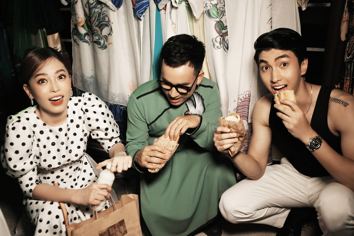Vì không kịp ăn tối trước giờ diễn nên cả hai tranh thủ lót dạ bằng bánh mì ở hậu trường.