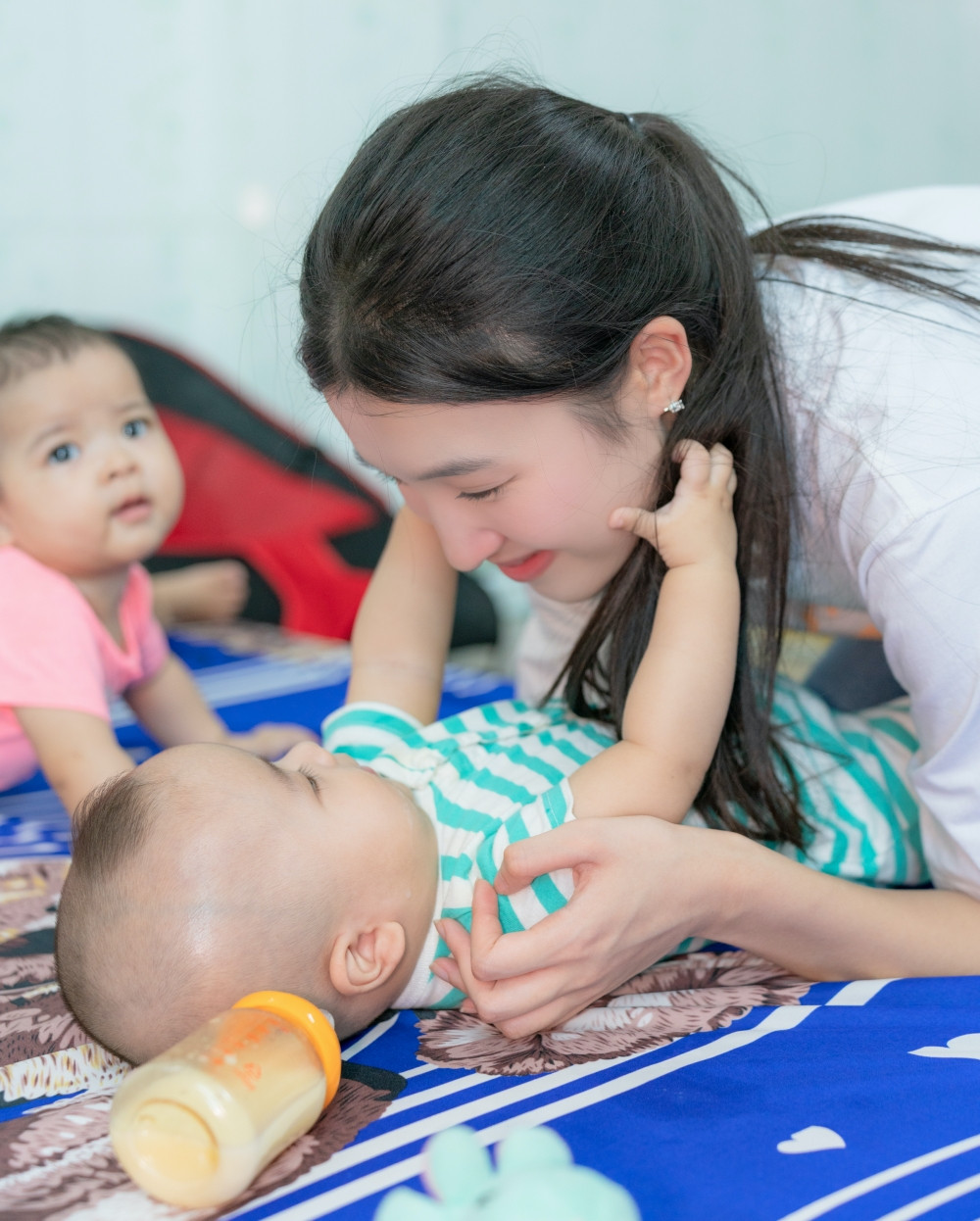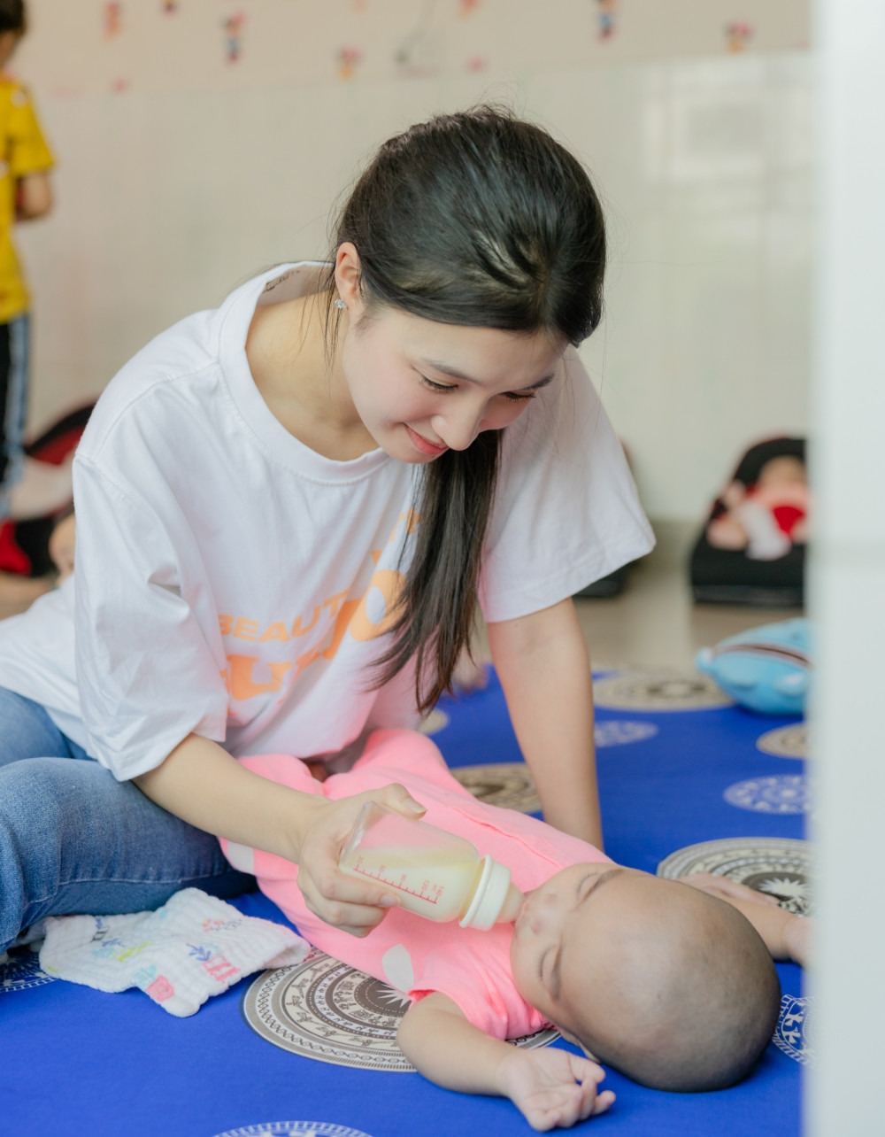 Phương Nhi đã trao tặng 100kg gạo, bánh kẹo, sữa, bỉm và các nhu yếu phẩm cho mái ấm. Ngoài ra, nàng hậu còn tặng các bé bút màu, sách tô màu, truyện cổ tích và cùng các em kể chuyện, hát ca, tô màu.