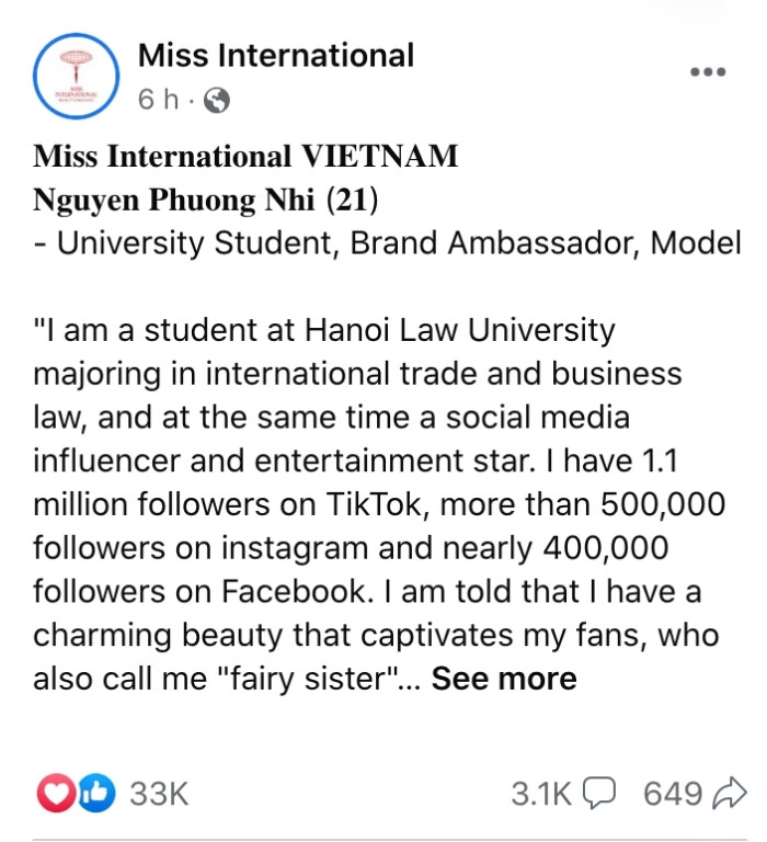 Mới đây, fanpage chính thức của cuộc thi Miss International đã giới thiệu về Á hậu Phương Nhi, đại diện của Việt Nam tại cuộc thi này năm nay. Nàng Á hậu đã có một đoạn giới thiệu ngắn gọn về bản thân bằng tiếng Anh, tạm dịch như sau: