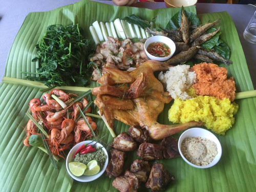 Bên cạnh món cháo cá lươn đồng, Thiên Lý cho biết cô còn rất ấn tượng với bữa trưa thưởng thức trong một nhà hàng ven sông Chày. Đó là mẹt xôi gà lót lá chuối, ăn kèm với các đặc sản của Quảng Bình như tôm sông, cá suối, rau rừng... Không chỉ ngon miệng, đẹp mắt, nó còn giúp cô nạp đủ năng lượng cho hành trình phía trước.