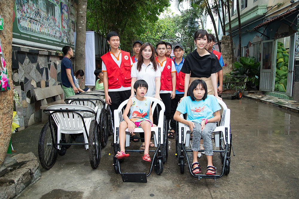 Nàng hậu gần gũi giúp các em khuyết tật uống sữa, tự tay mặc đồ cho từng em, cùng các bạn trang điểm cho các bé trong đội văn nghệ sẽ biểu diễn mừng lễ trung thu của trung tâm.
