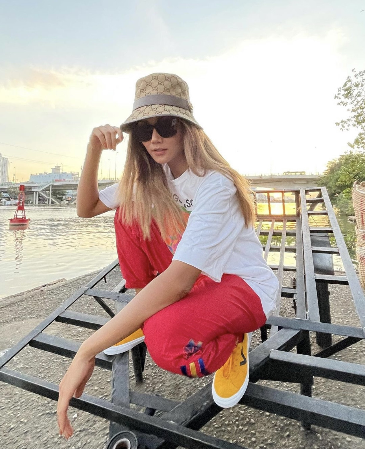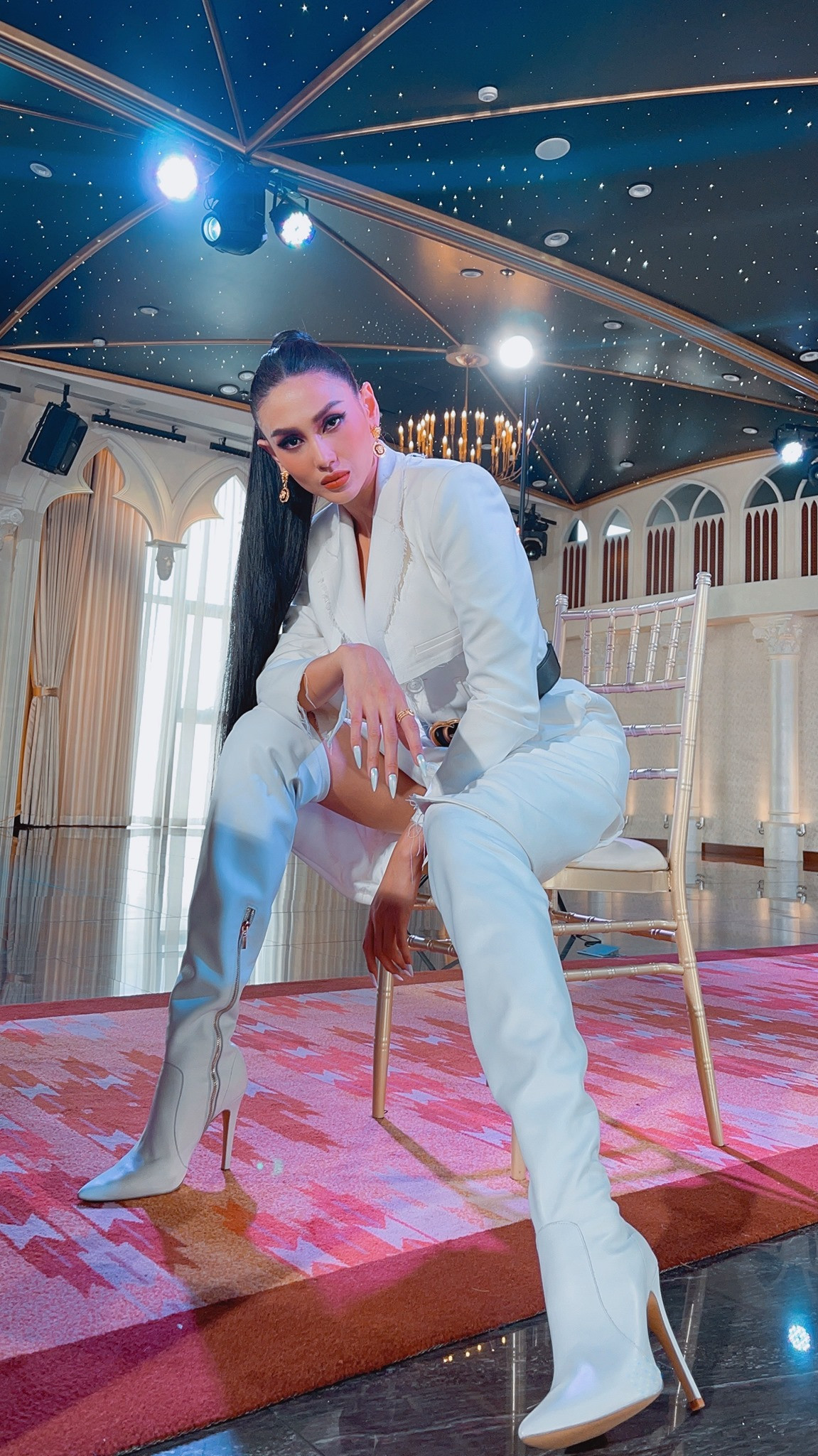 Á hậu Ngọc Thảo diện jumpsuit chất liệu sequin lấp lánh trong ngày thứ 3 cách ly ở Thái Lan. Thiết kế giúp người đẹp khoe được vòng một vô cùng táo bạo.