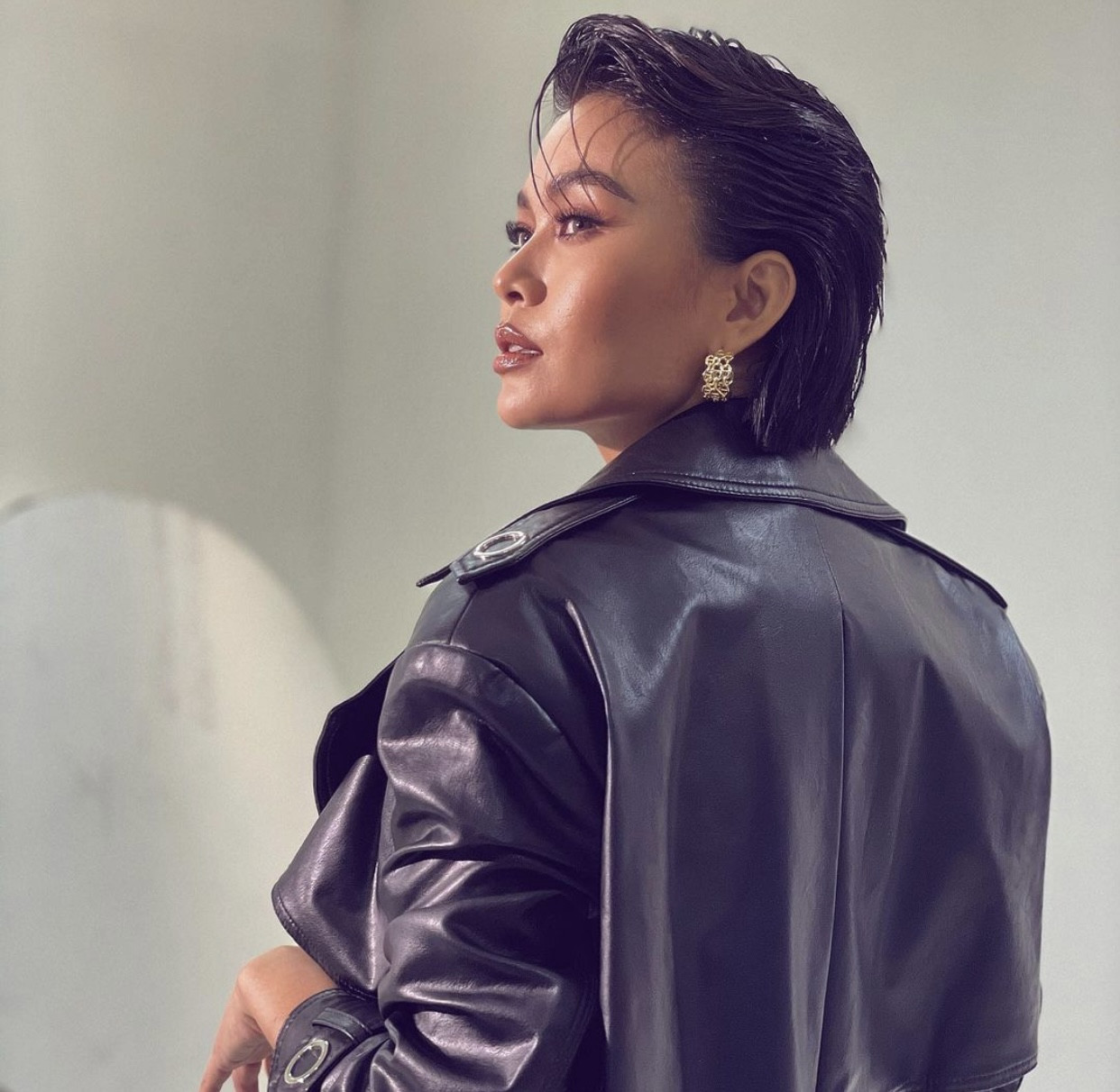 Á hậu Mâu Thuỷ cá tính với mái tóc ngắn và áo khoác da hầm hố.