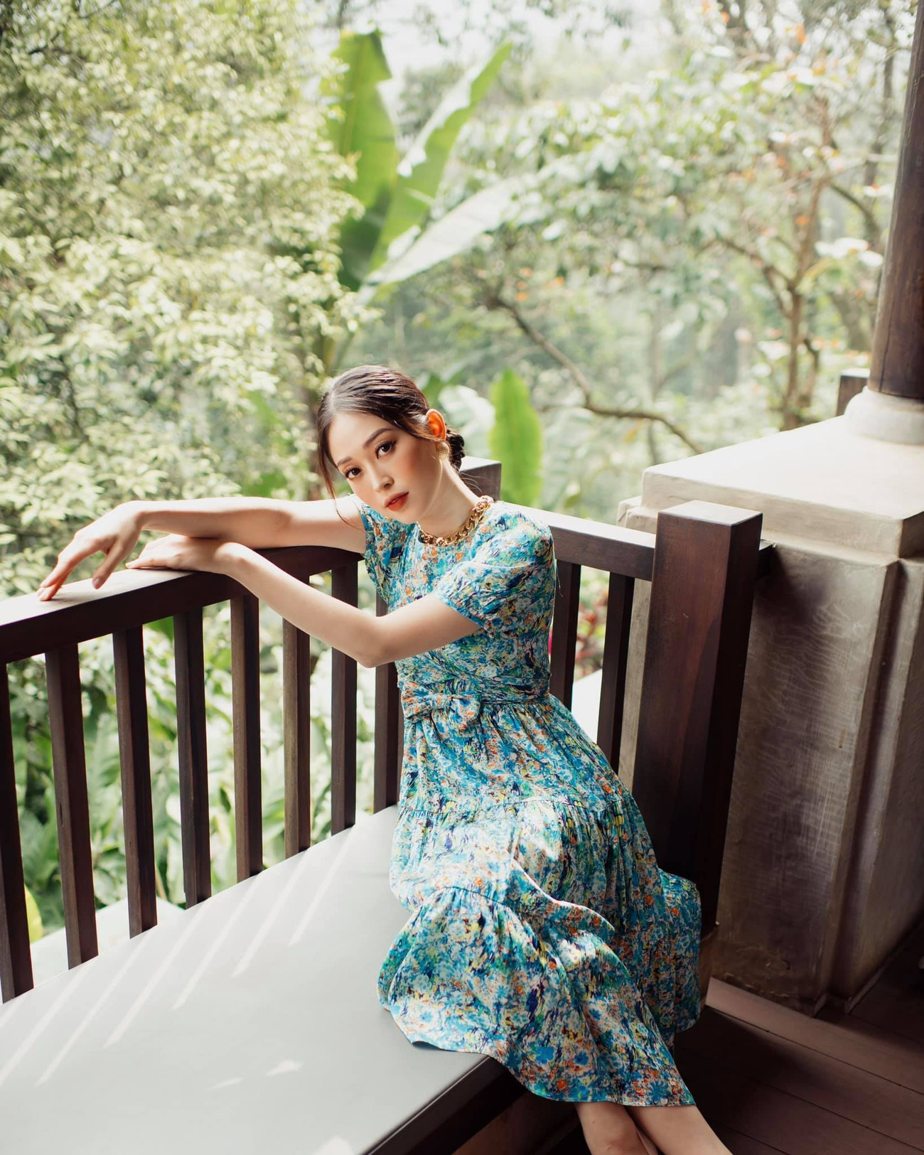 Á hậu Phương Nga đẹp mơ màng với bộ váy hoạ tiết hoa.