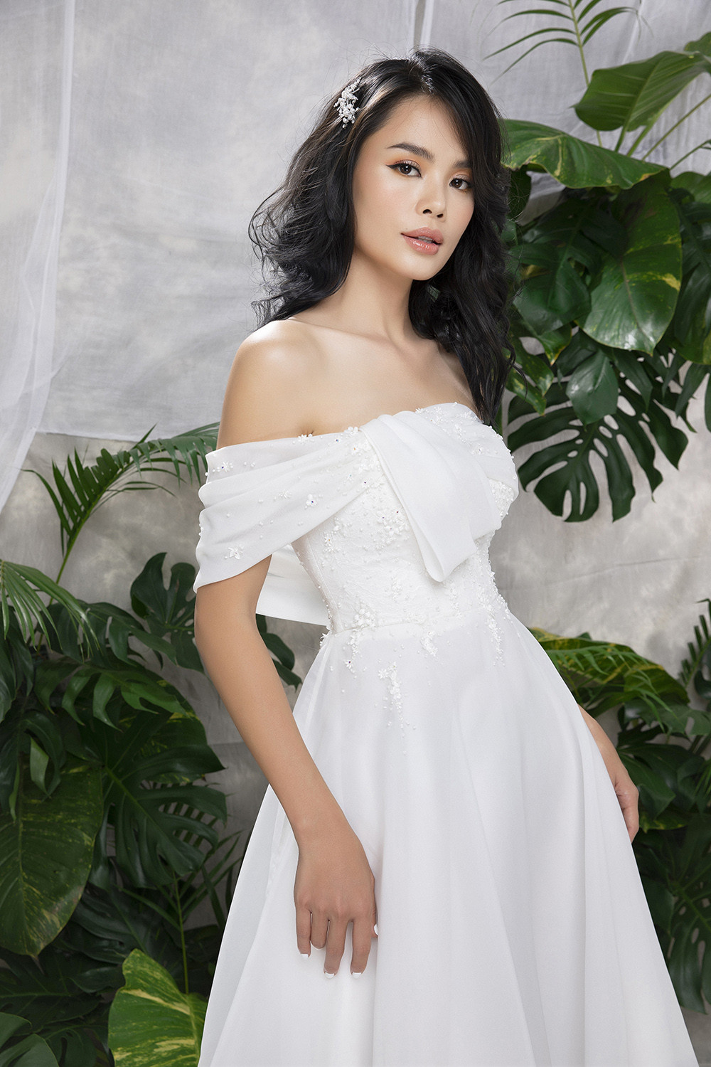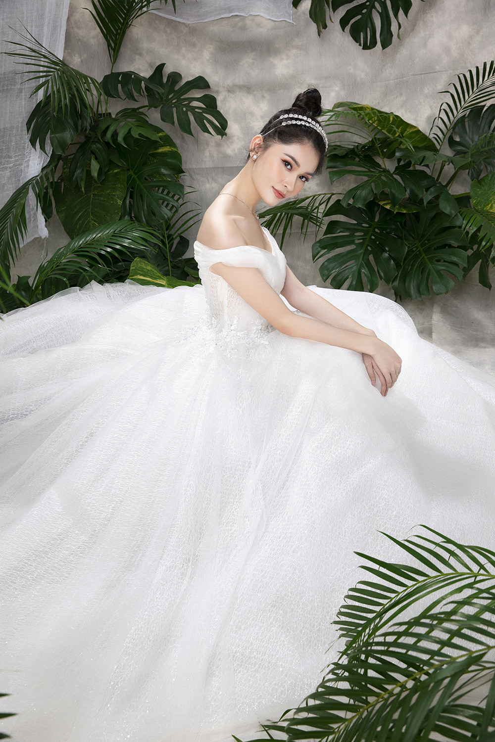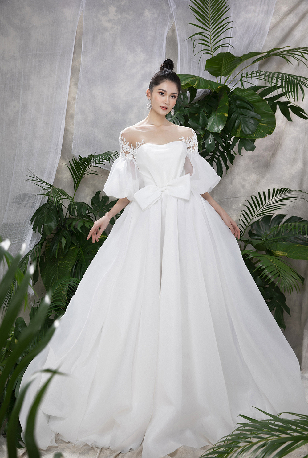Người mẫu Thu Hiền xinh đẹp, yêu kiều không kém với các mẫu váy cưới khoe vai trần.