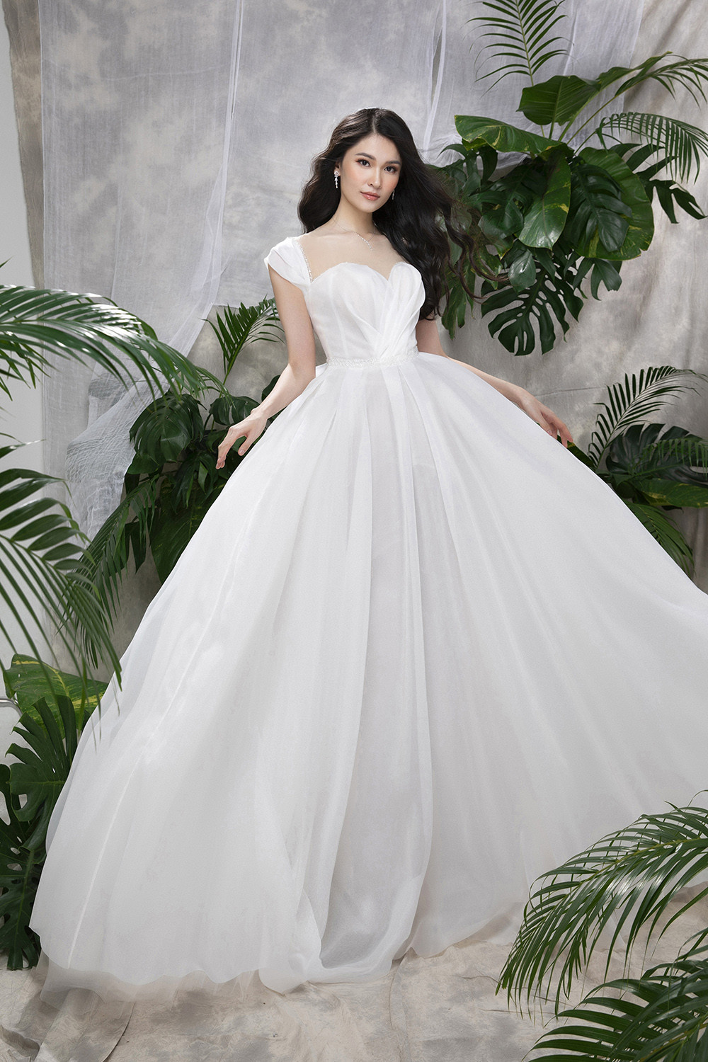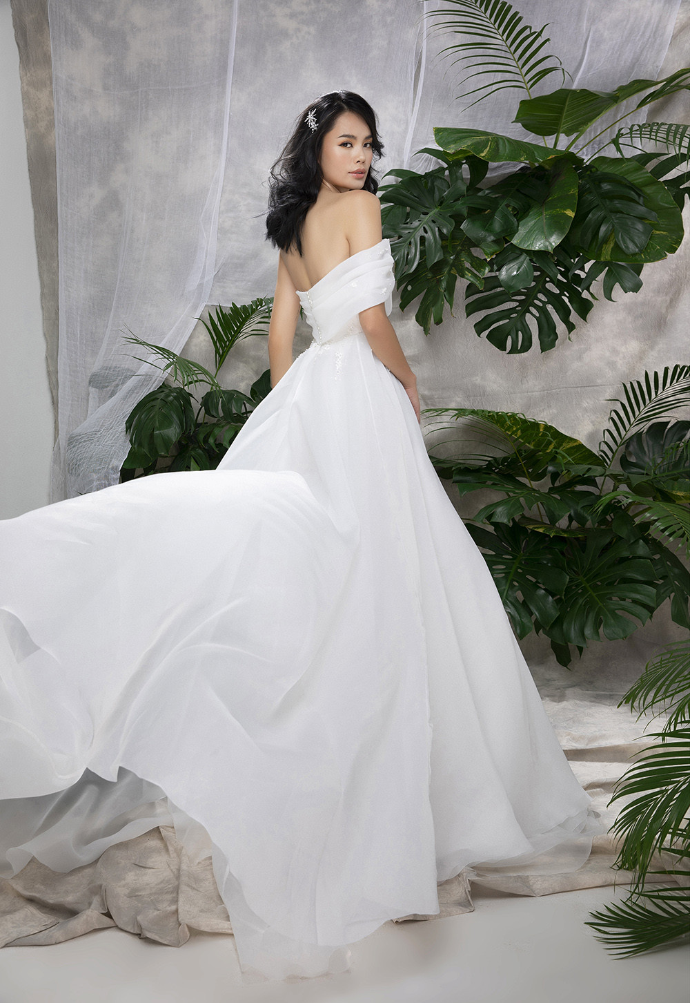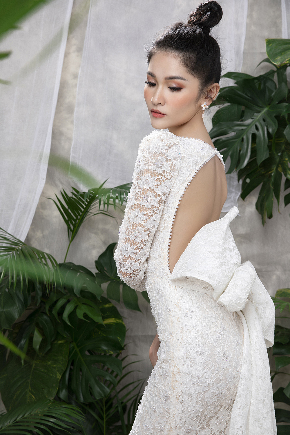 Người mẫu Thu Hiền xinh đẹp, yêu kiều không kém với các mẫu váy cưới khoe vai trần.