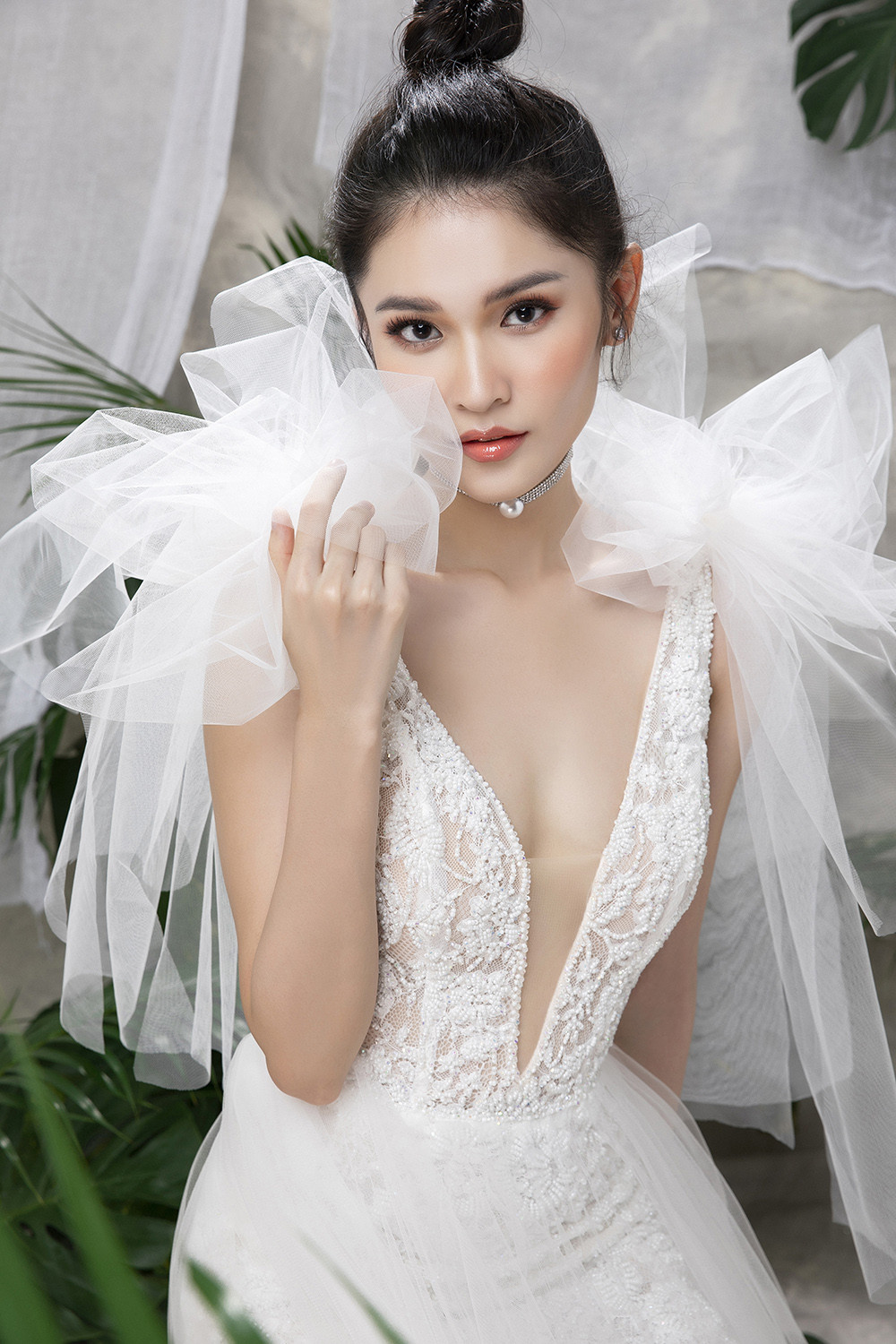 Nàng Á hậu xinh đẹp diện một mẫu váy cưới xẻ ngực cực táo bạo và gợi cảm.