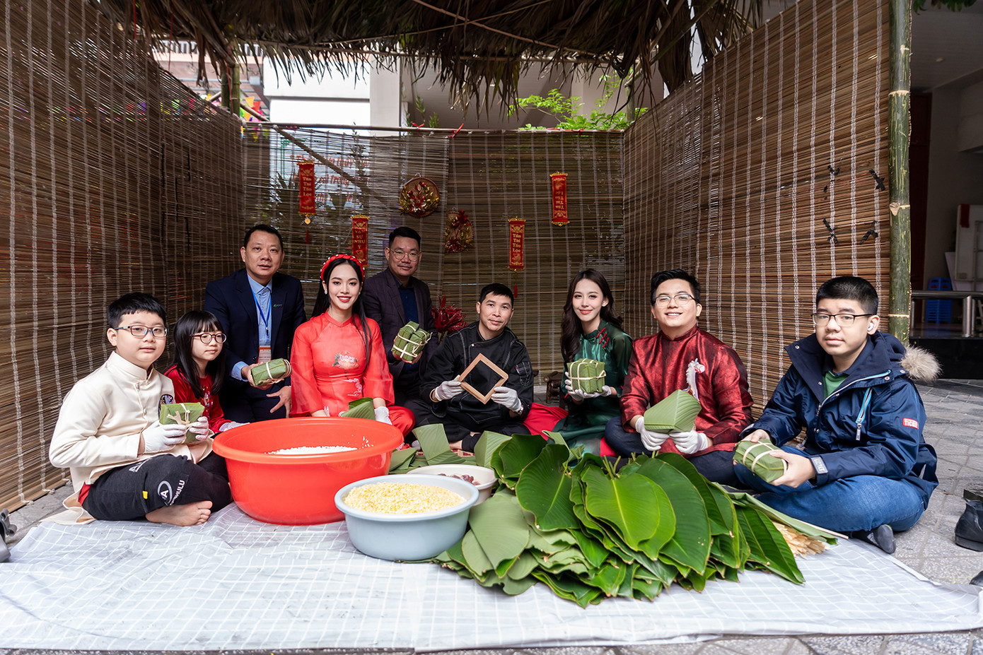 Á hậu Trịnh Thùy Linh, Ngọc Hằng có mặt tại trường tiểu học Chu Văn An để tham gia gói 2000 chiếc bánh chưng xanh cùng các em nhỏ học sinh, sinh viên dưới sự hướng dẫn của các đầu bếp để trao tặng cho trẻ em vùng cao.