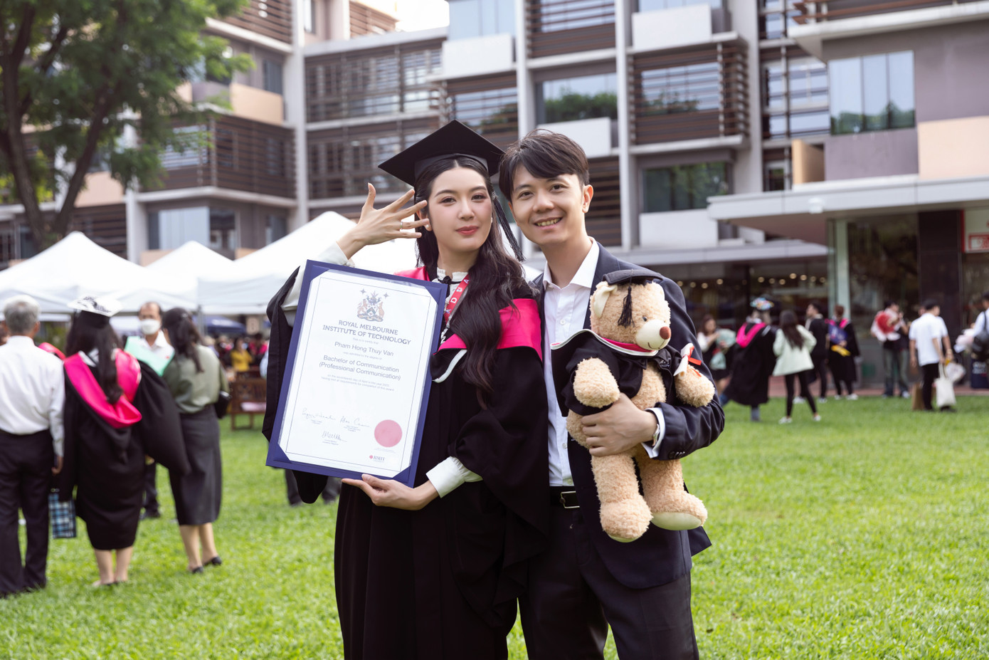 Ngày 17/4, Á hậu Thuý Vân chia sẻ đã nhận bằng tốt nghiệp Đại học RMIT tại TPHCM. Trong ngày tốt nghiệp, chồng Thúy Vân là doanh nhân Nhật Vũ cũng có mặt để tặng hoa và chúc mừng vợ.