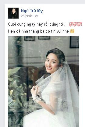 Trong hình ảnh đăng tải gần đây nhất, Ngô Trà My gây tò mò cho công chúng khi diện chiếc váy cưới trắng bồng bềnh chụp ảnh trong một khung cảnh lãng mạn với chia sẻ: “Cuối cùng ngày này rồi cũng tới... Hẹn cả nhà tháng ba có tin vui nhé!”.