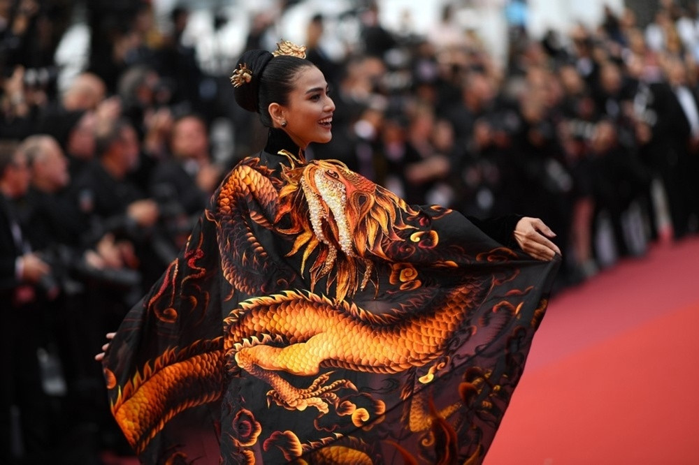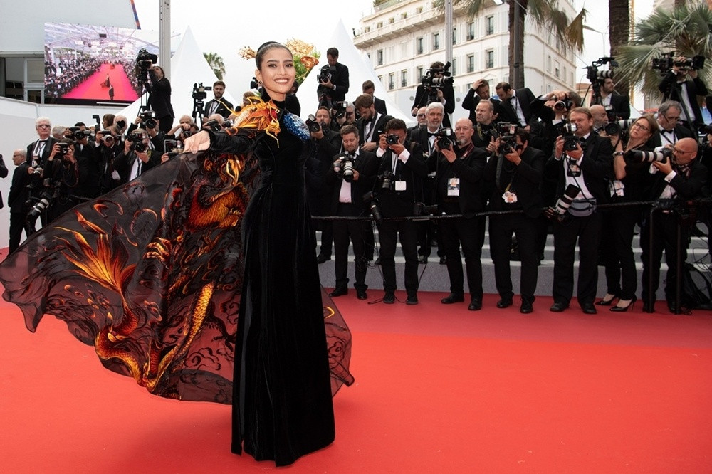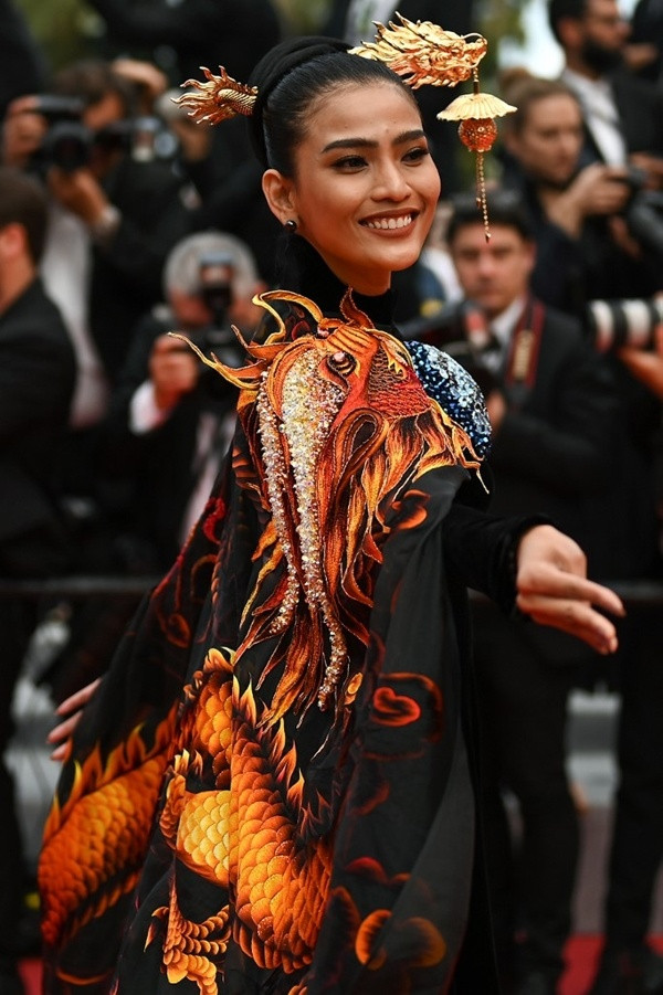 Trương Thị May được mời dự lễ ra mắt bộ phim Oh Mercy! tại LHP Cannes 2019. Người đẹp mặc áo dài truyền thống màu đen, phần áo choàng thêu họa tiết rồng bay ấn tượng do NTK Đinh Văn Thơ thực hiện.