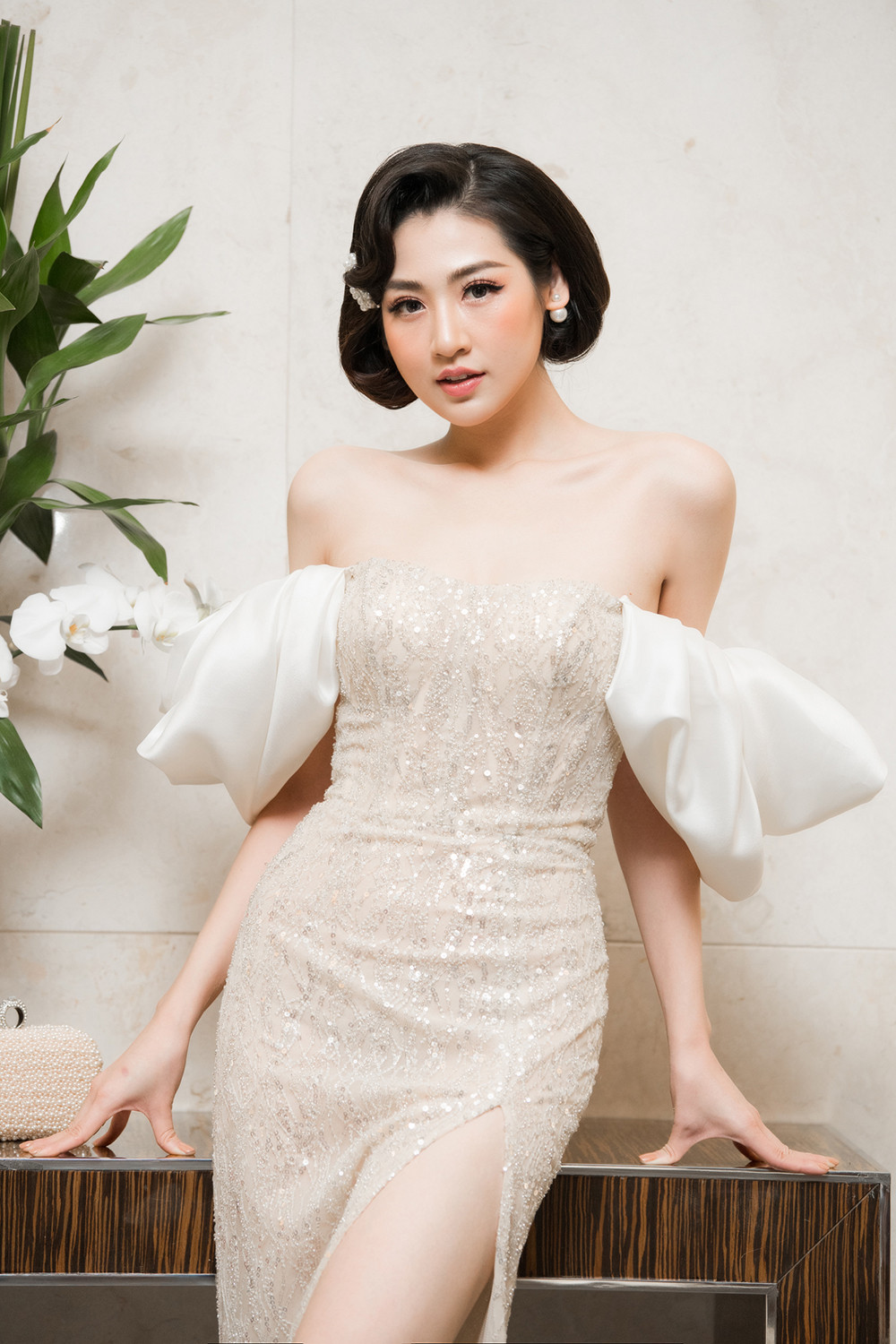 Lựa chọn lối trang điểm tự nhiên, tôn những nét đẹp vốn có, kết hợp cách bới tóc cổ điển, Tú Anh lộng lẫy và cuốn hút đến lạ thường.