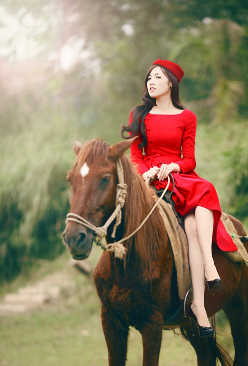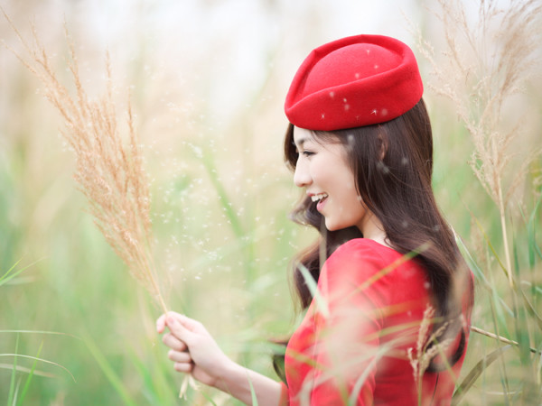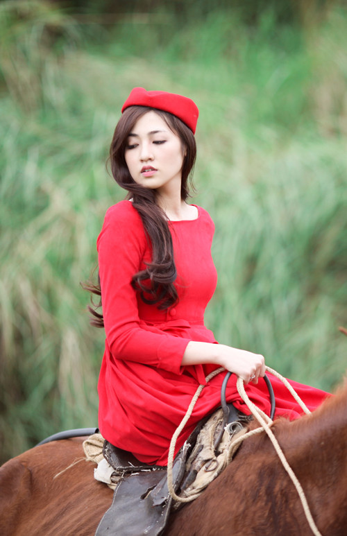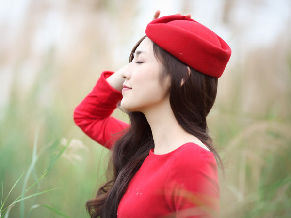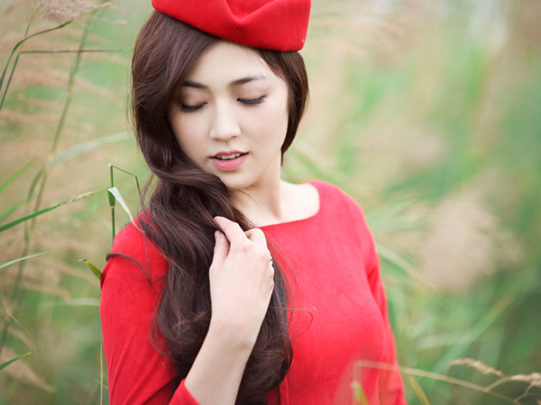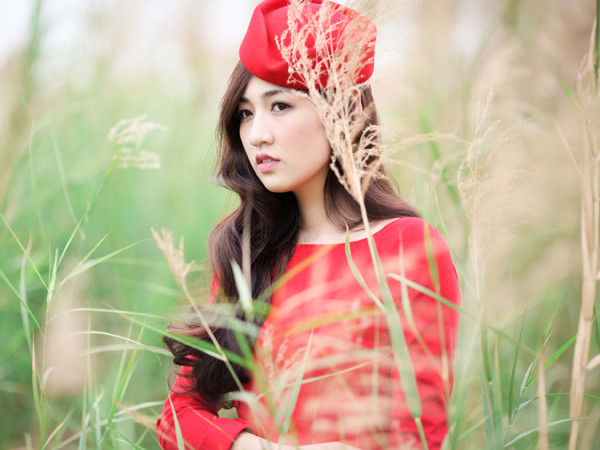 Trong bộ ảnh đón Giáng sinh, Á hậu diện trang phục đỏ rực dạo chơi trên cánh đồng lau thơ mộng. Cô khéo léo đội thêm chiếc mũ xinh xắn, tôn vẻ đẹp ngọt ngào và yêu kiều.