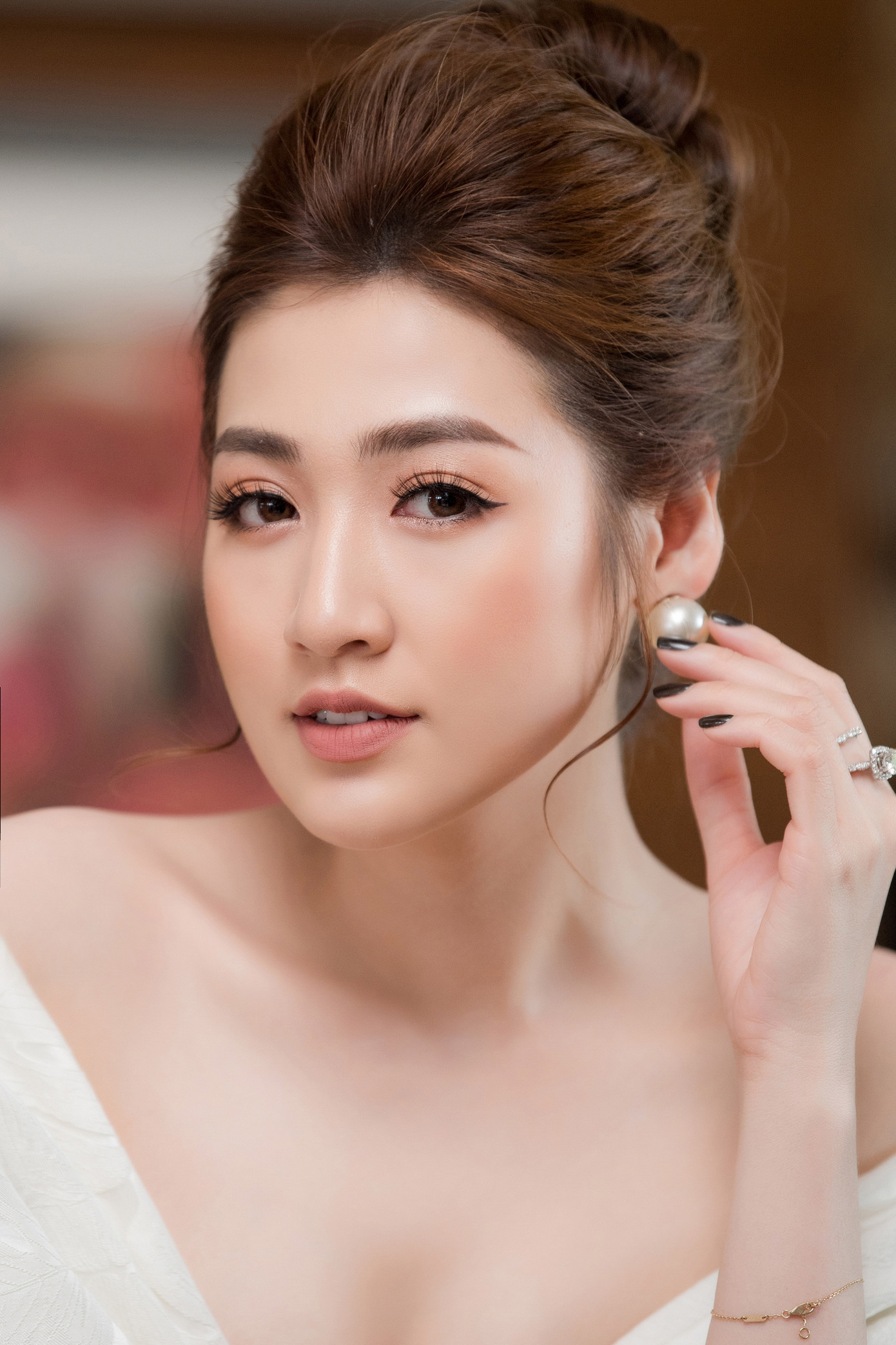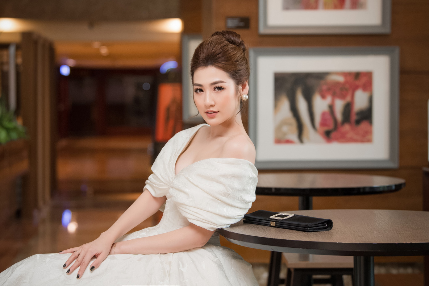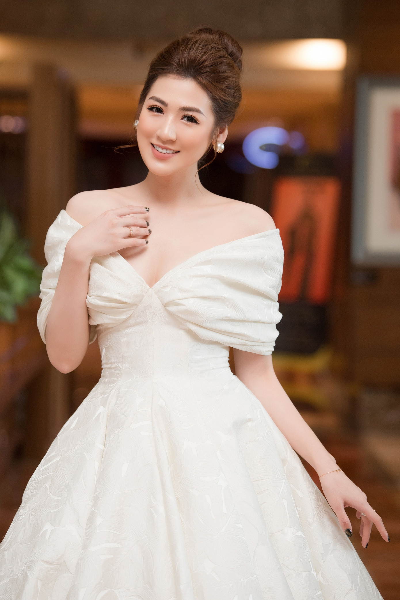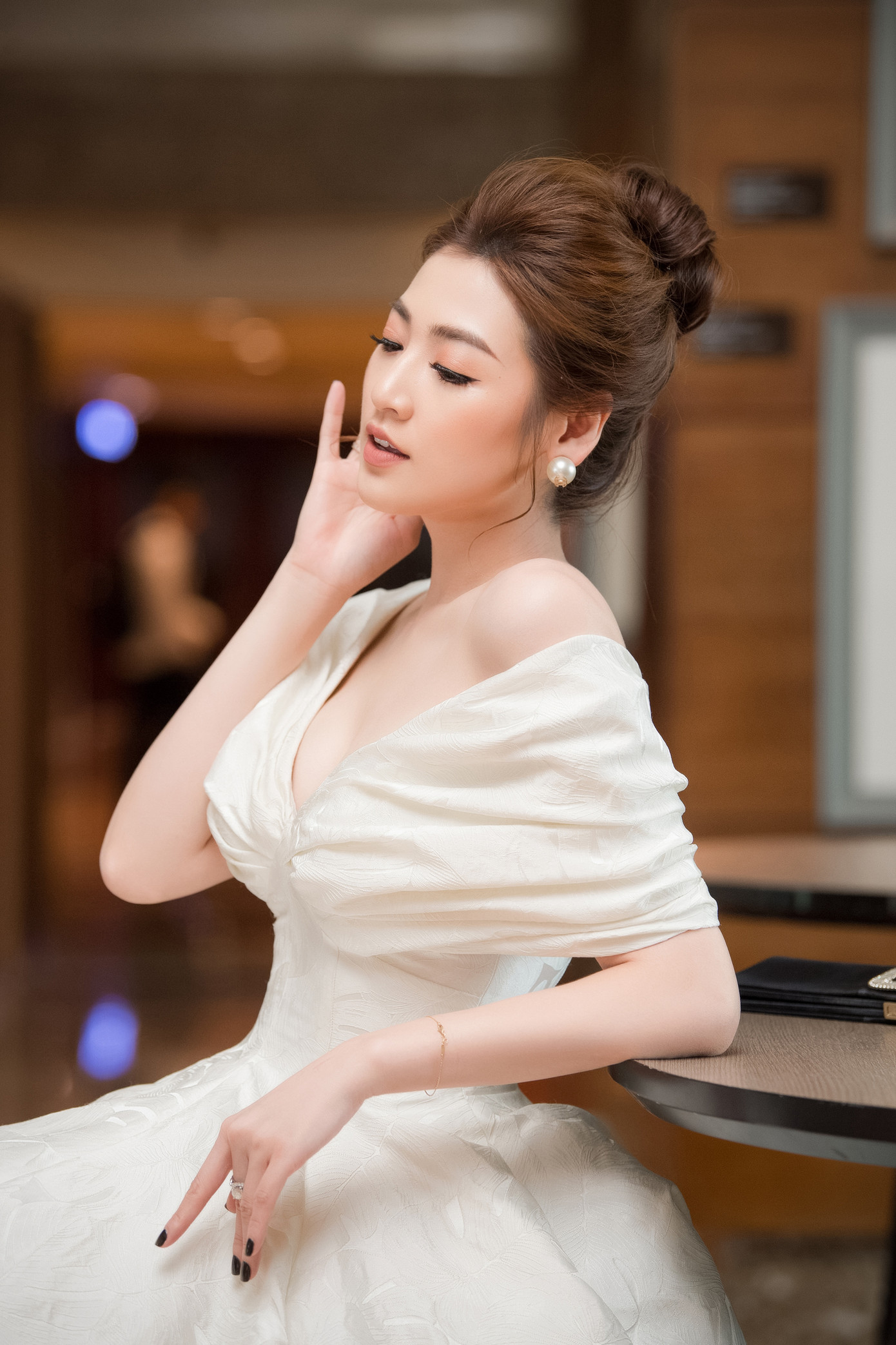 Á Hậu khoe được hết các thế mạnh của cơ thể như chiếc cổ ngọc, bờ vai thon và làn da trắng ngần thuần khiết.