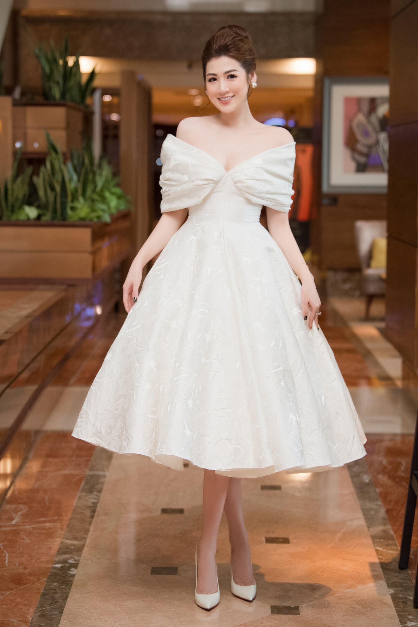 Bộ váy với phần cầu vai cách điệu hình chiếc nơ, trễ nải giúp Tú Anh khoe vai trần quyến rũ và vòng một nóng bỏng.