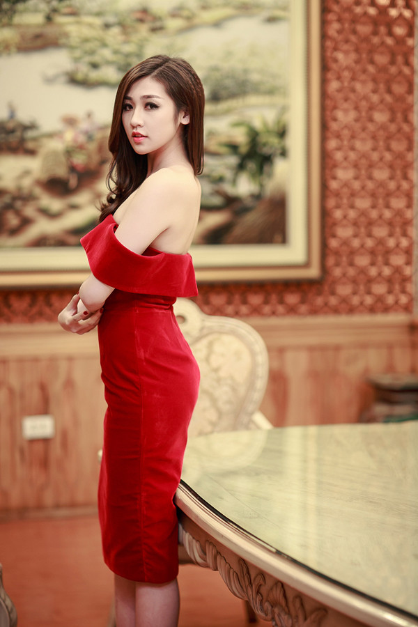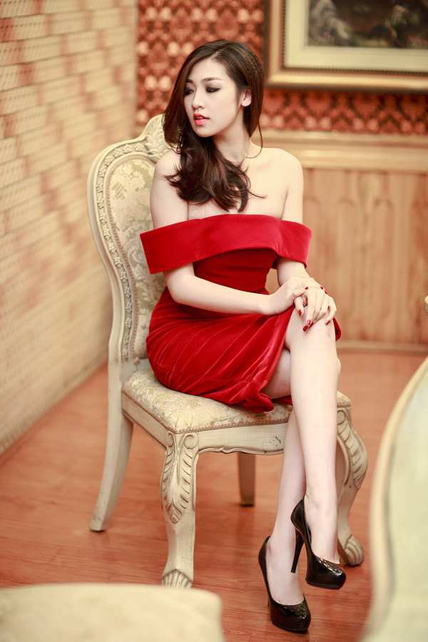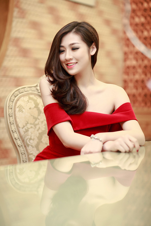 TPO - Á hậu 1 của cuộc thi Hoa hậu Việt Nam 2012 diện váy đỏ rực trễ nải vai trần gợi cảm, khoe làn da trắng muốt mịn màng khi tham dự một cuộc giao lưu về sắc đẹp.