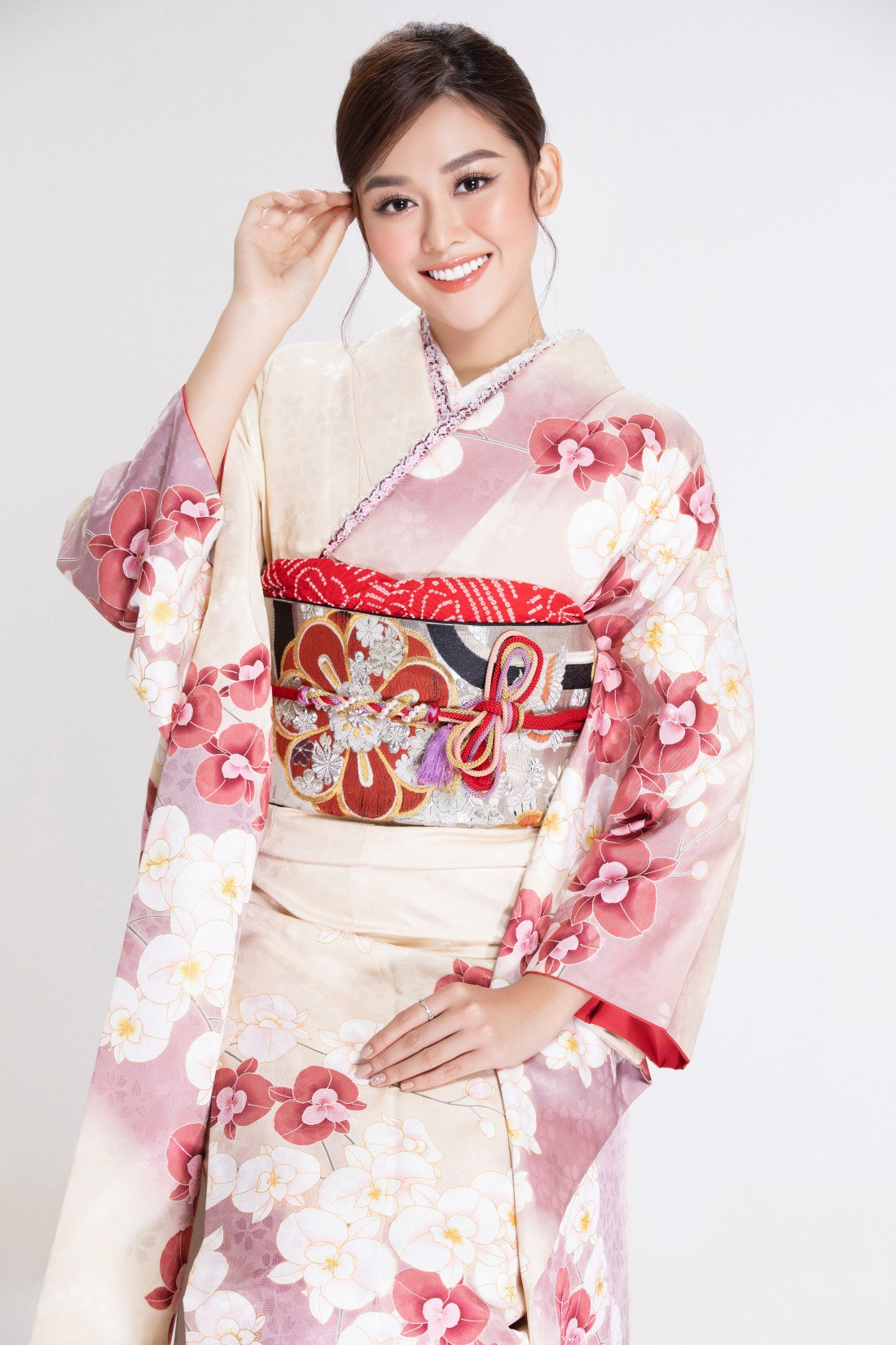 Nhan sắc lẫn vóc dáng của nàng á hậu lại được biến hóa lạ lẫm và cuốn hút đến khó rời mắt trong trang phục kimono.