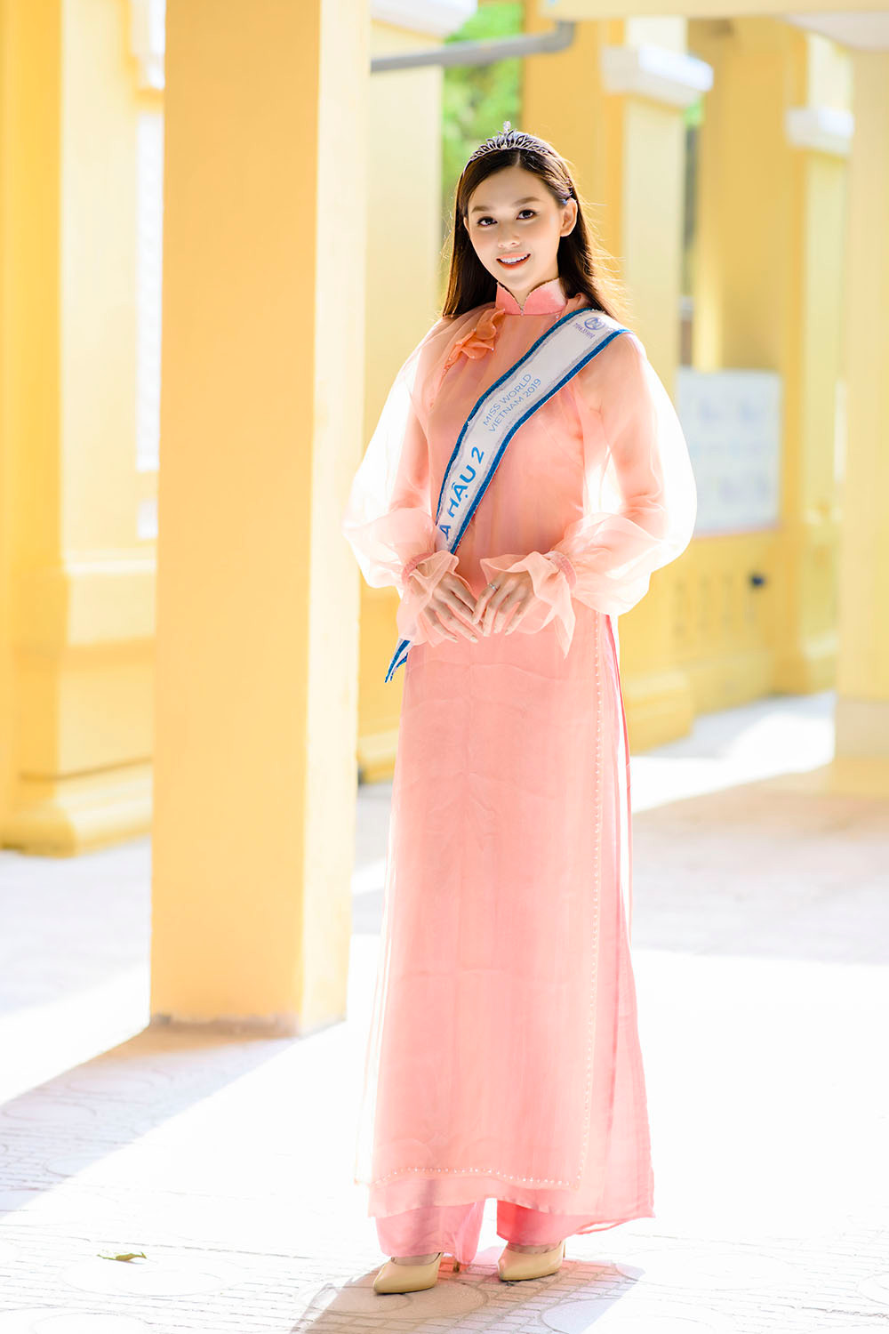 Á hậu Tường San diện chiếc áo dài cách tân màu hồng phấn, điều đặc biệt là chiếc áo dài này do chính tay mẹ của nàng á hậu thiết kế.