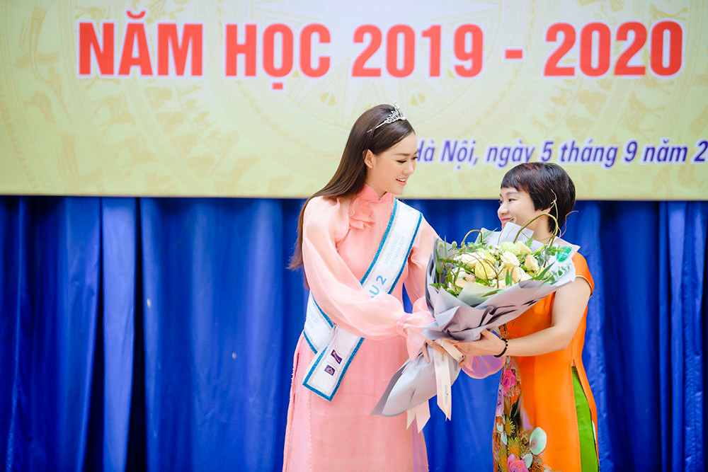 Á hậu đã gặp lại cô giáo cũ và gửi tặng gửi tặng một phần học bổng vào quỹ nhà trường, đồng thời phát biểu cảm nghĩ và chia sẻ cảm xúc của mình đến toàn thể học sinh của ngôi trường này.
