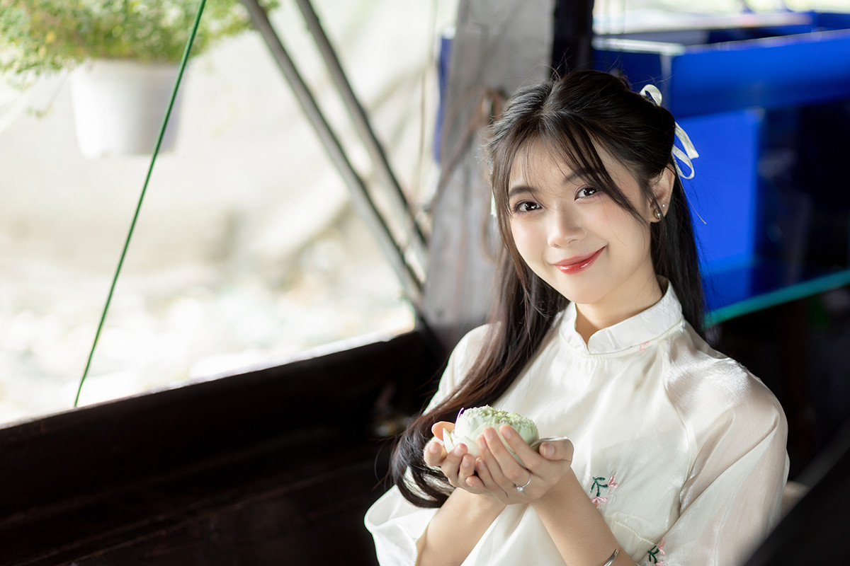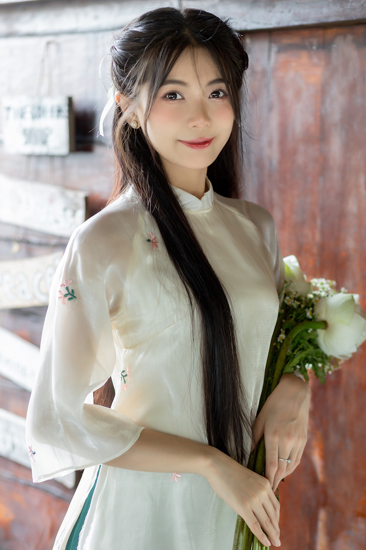 | Bộ ảnh "Nàng Xuân" của Bảo Trinh mang đến hình ảnh một thiếu nữ tràn đầy năng lượng, khoác trên mình chiếc áo dài nhẹ nhàng, thướt tha, với mái tóc đen dài thuần Việt. |