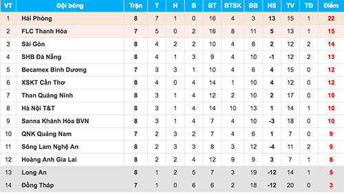 Đánh bại Đà Nẵng 2-1, Hà Nội T&T vươn từ vị trí thứ 12 lên thứ tám. Thầy trò HLV Chu Đình Nghiêm hiện có 10 điểm, kém ngôi đầu của Hải Phòng 12 điểm.