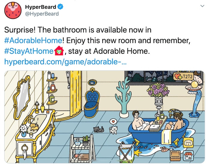 Mới đây, HyperBeard - nhà phát hành tựa game Adorable Home đã khiến các con sen càng thêm phấn khích khi thông báo cập nhật thêm tuỳ chọn phòng tắm (Bathroom), một tính năng đã được trông ngóng từ lâu. Đồng thời, HyperBeard cũng không quên kêu gọi người chơi ở nhà trong thời gian này để tránh lây nhiễm Covid-19.